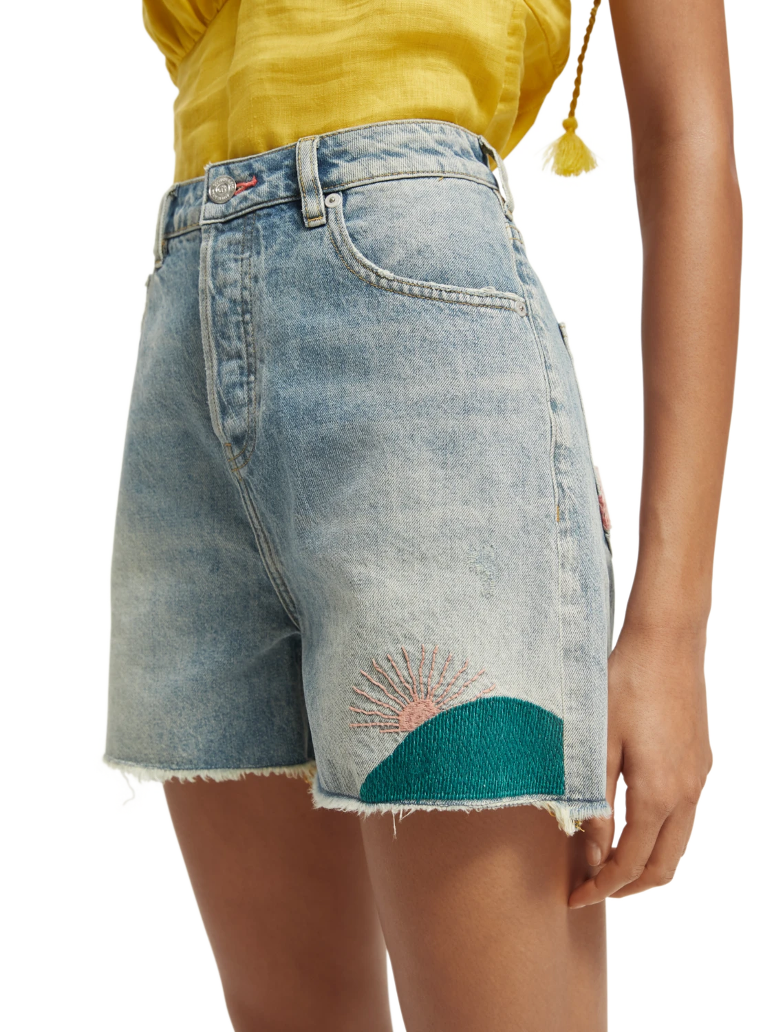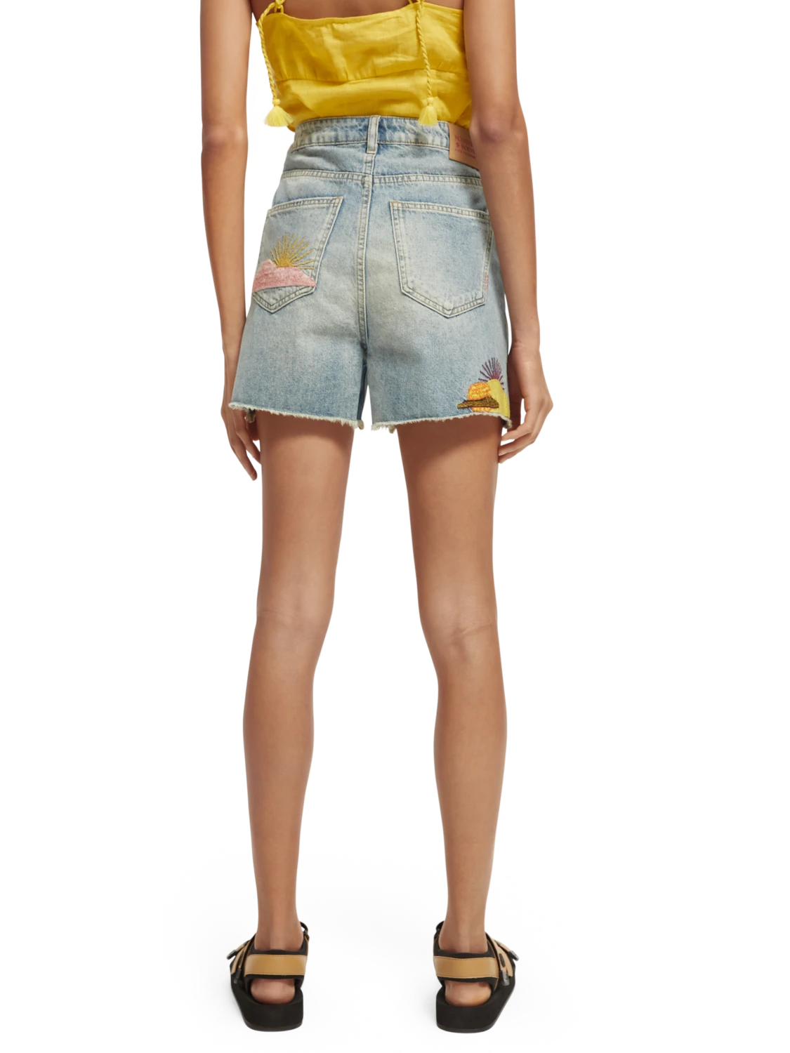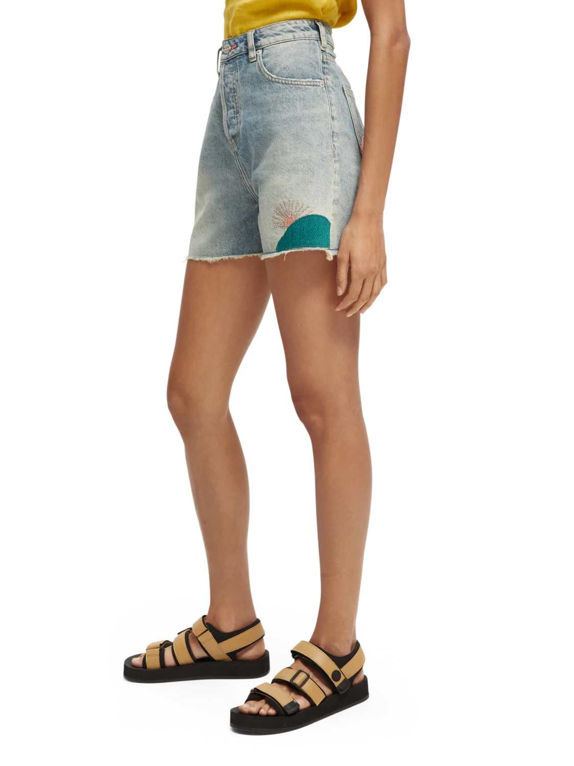 The Coast denim shorts take you on a walk on the beach. The high-rise cut is complemented by special embroidery placements envisioned by Abel Macias.