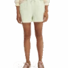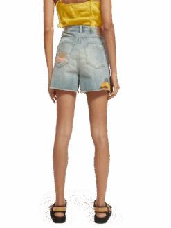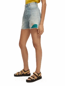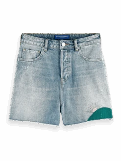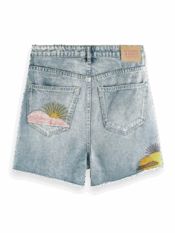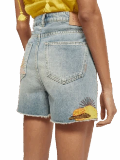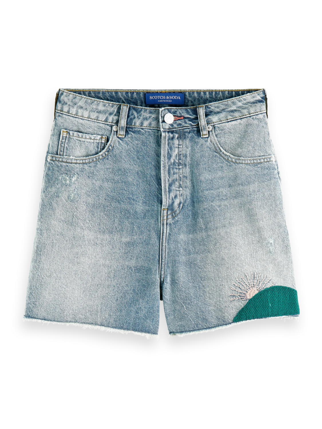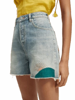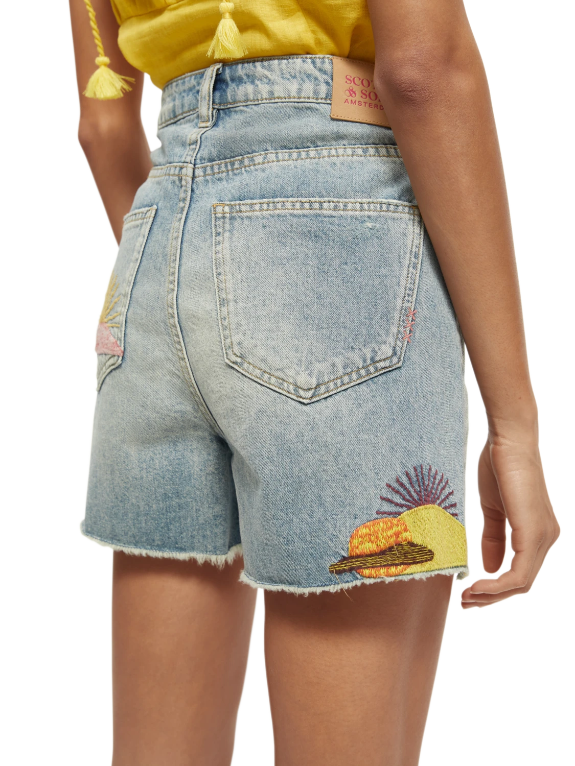The Coast denim shorts take you on a walk on the beach. The high-rise cut is complemented by special embroidery placements envisioned by Abel Macias.