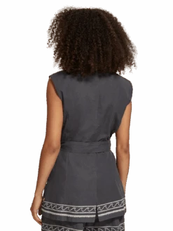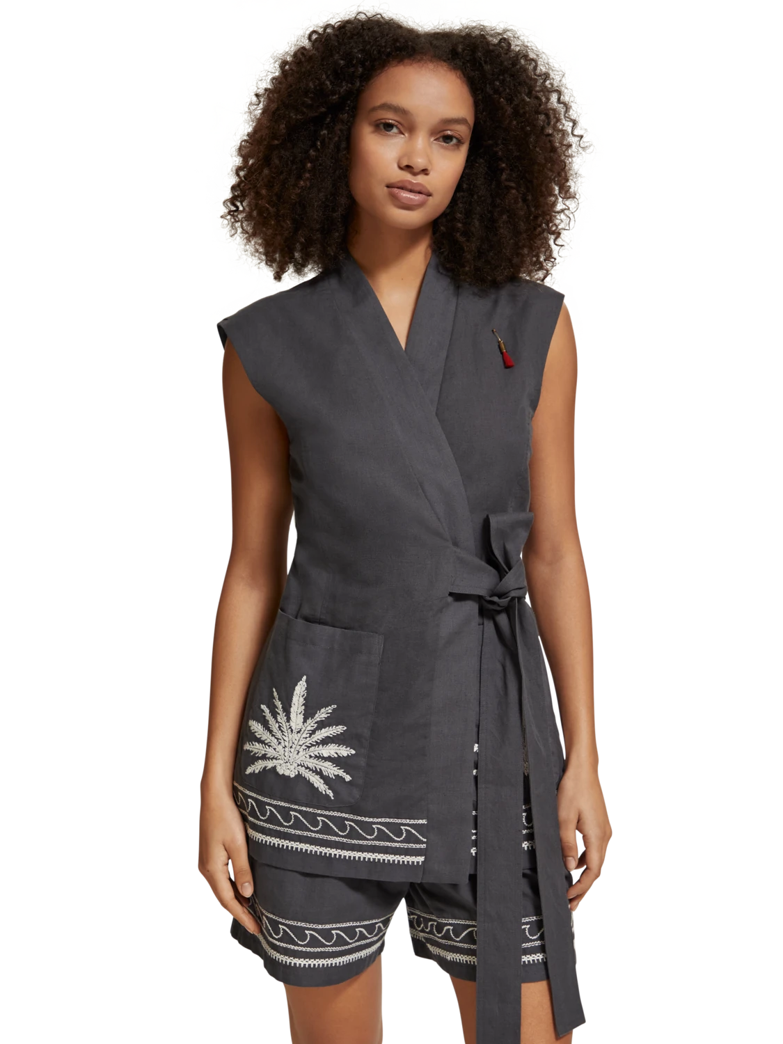 Elevate your style in our Belted Gilet with Palm Embroidery. The palm embroidery adds a touch of tropical flair to this versatile piece. Whether you wear it as a standalone statement or layer it over your favorite outfit, this gilet is sure to turn heads. Crafted with attention to detail and made from high-quality materials, it stands as a testament to your individuality and commitment to original design. Embrace the power of self-expression and let your true style shine through.