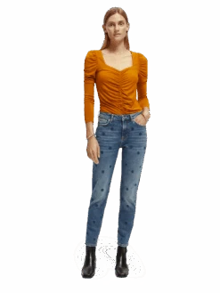 The High Five is a stretch denim that offers a relaxed, flexible feeling. This style sits high on the waist with a slim, tapered leg that stops at just above the ankle. Washed in mid-blue tone with embroidered star detailing and finished with five-pocket styling and a zip fly.