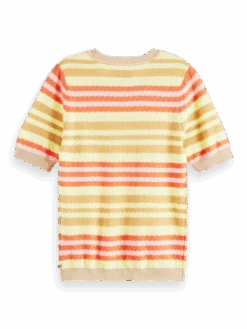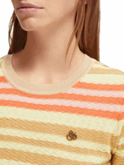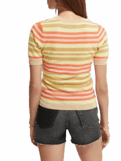 Our knitted, short sleeved, colourblock top. Just one look and you’ll know that it’s special. Made with organic cotton: non-GMO seeds are grown on land free from pesticides and synthetic fertilisers, lower water use, and farmed using crop rotation which is better for soil health.