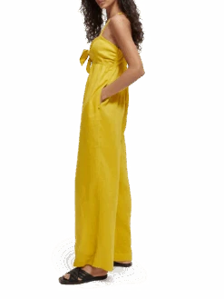 Light up the room with this jumpsuit made out of silky and rich linen. The suit has an open back, sleeveless design with a knotted closure,