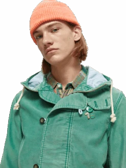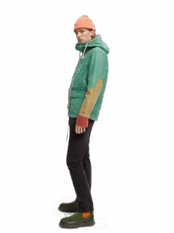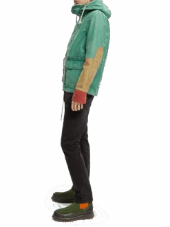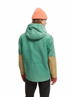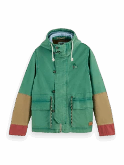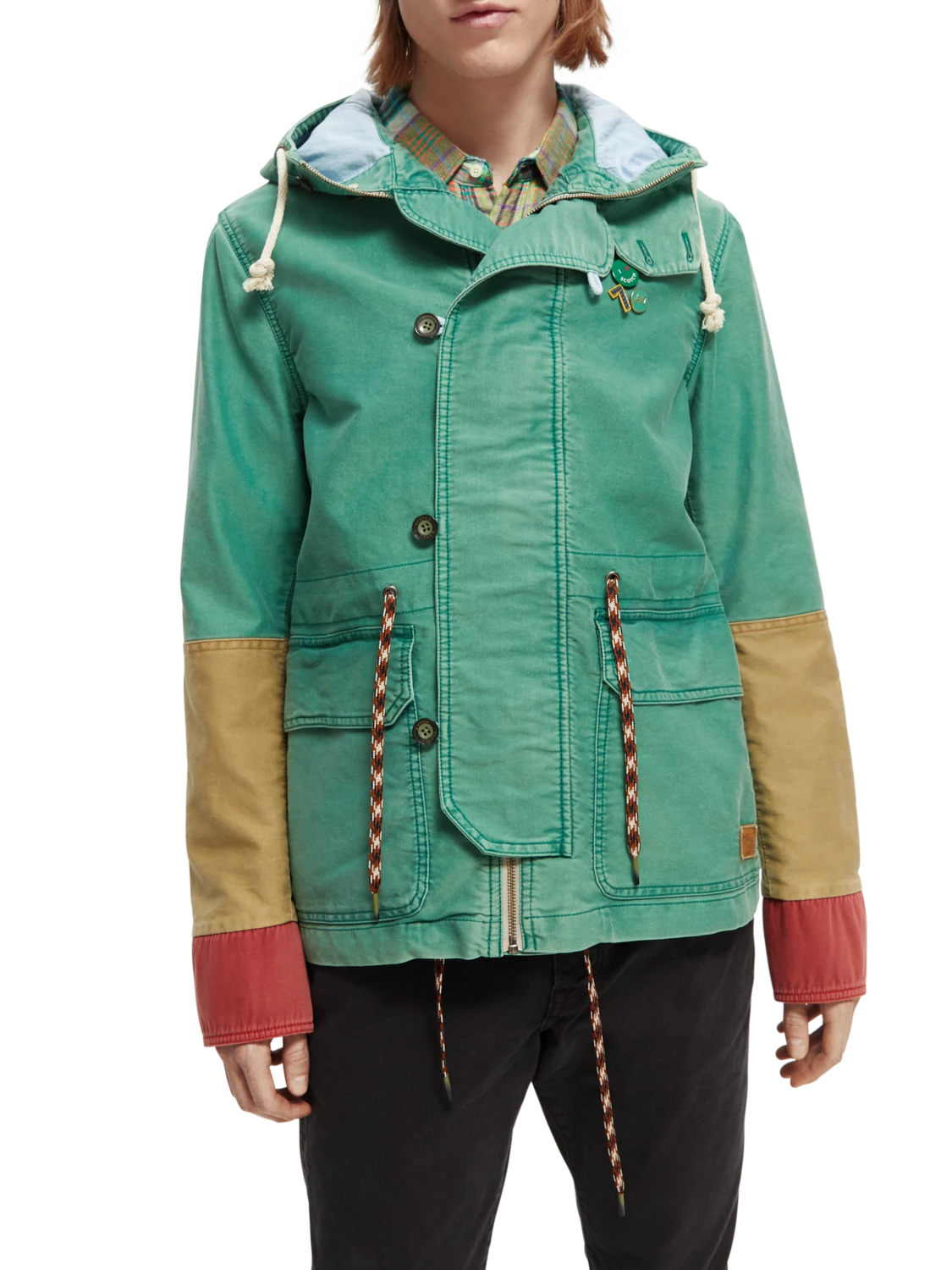 The latest take on the hooded jacket, this variation is available in a stunning washed colour block design. Featuring a drawstring in the hood and at the waist making adjustment for the perfect fit a breeze. Two large pockets are accompanied by a full-length zip closure, cleverly hidden with a fabric flap, secured by buttons.