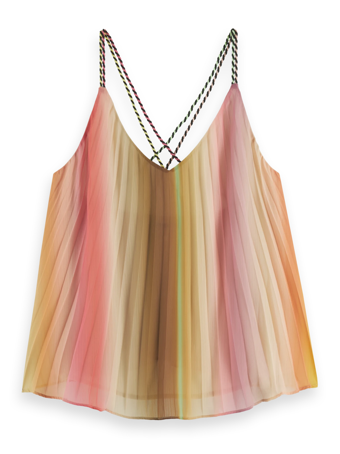 Our latest pleated tank top comes with a V-neck collar and thin, spaghetti-style straps. Featuring an all-over rainbow colouration, this versatile piece is easily worn on its own or layered to add an extra dimension to your favourite looks.