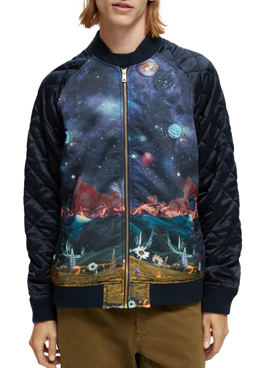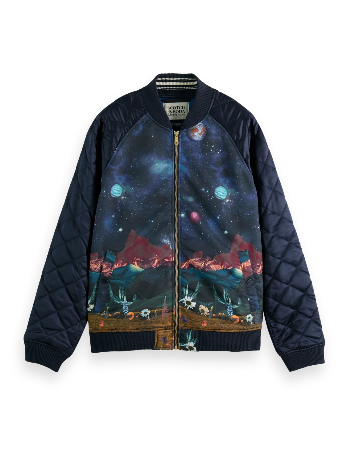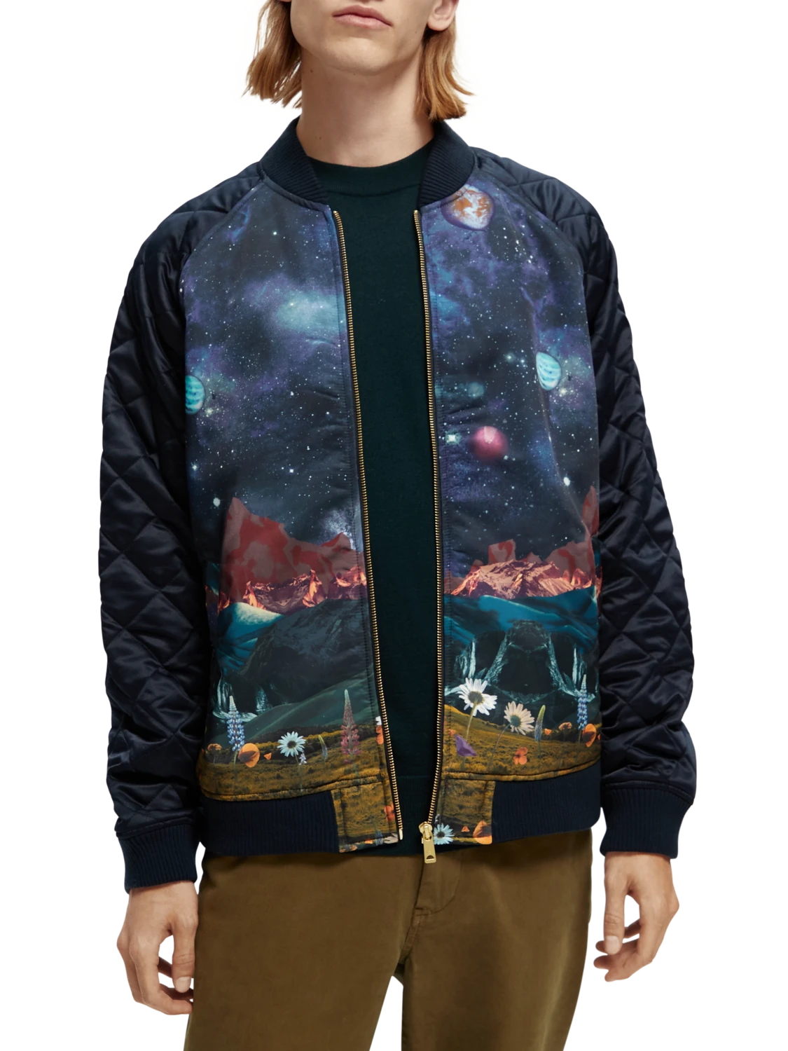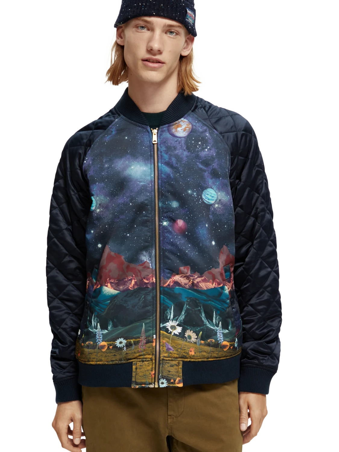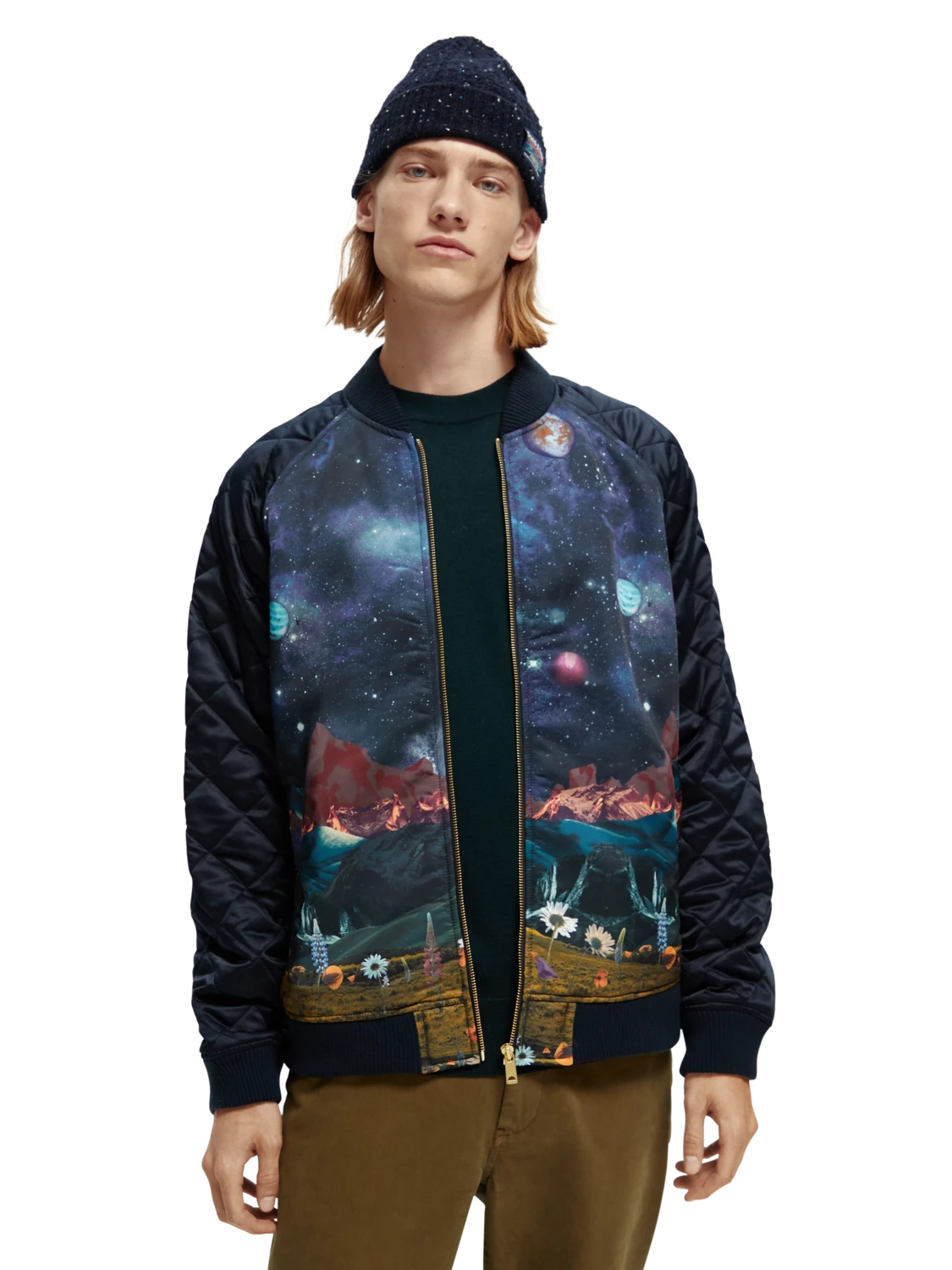 The bomber jacket is a proven style, popular across generations. This printed bomber jacket has a zip closure, finished with a ribbed hem and cuff .