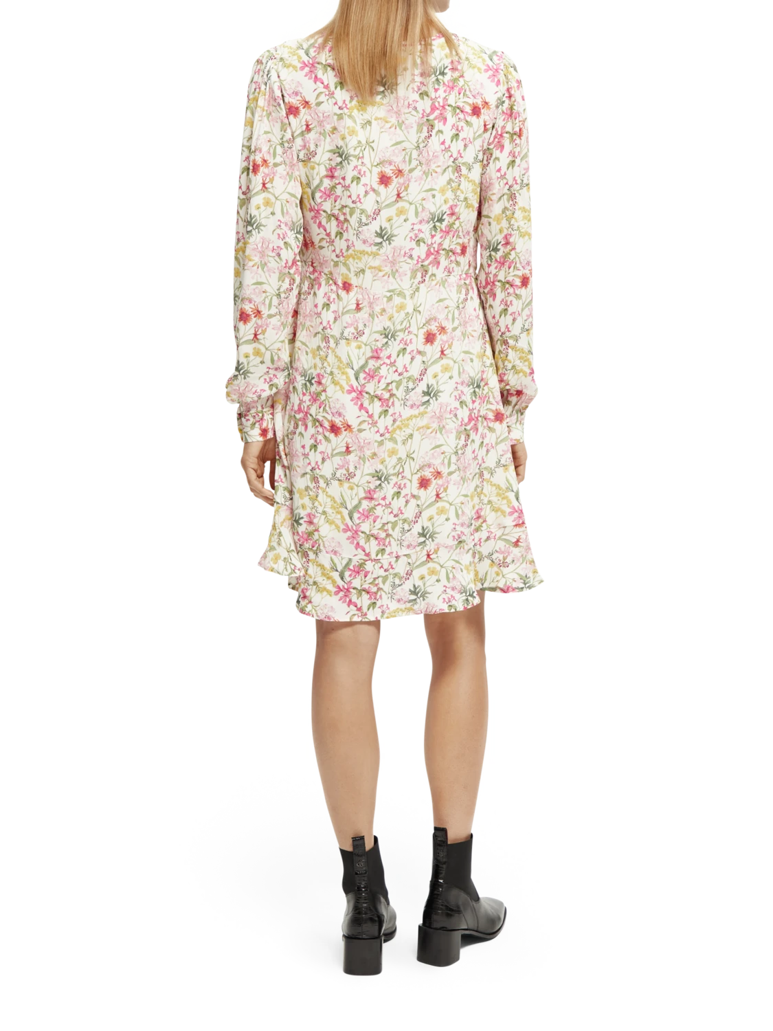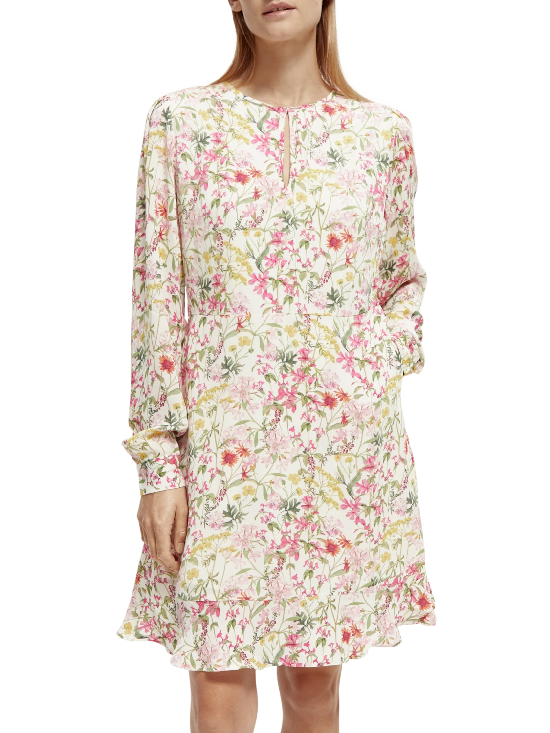 This mini-length dress comes adorned with an eye-catching print. Featuring a buttoned collar which when closed makes for a keyhole neckline – undo the button to transform your look into a V-neck style. Finished with long-sleeves and ruffling detail along the hem.