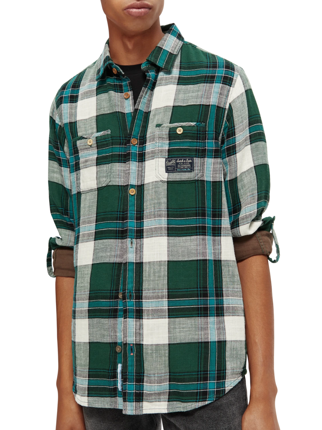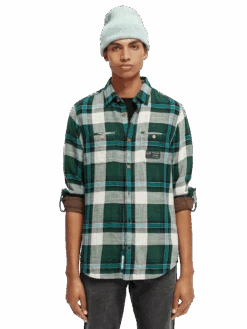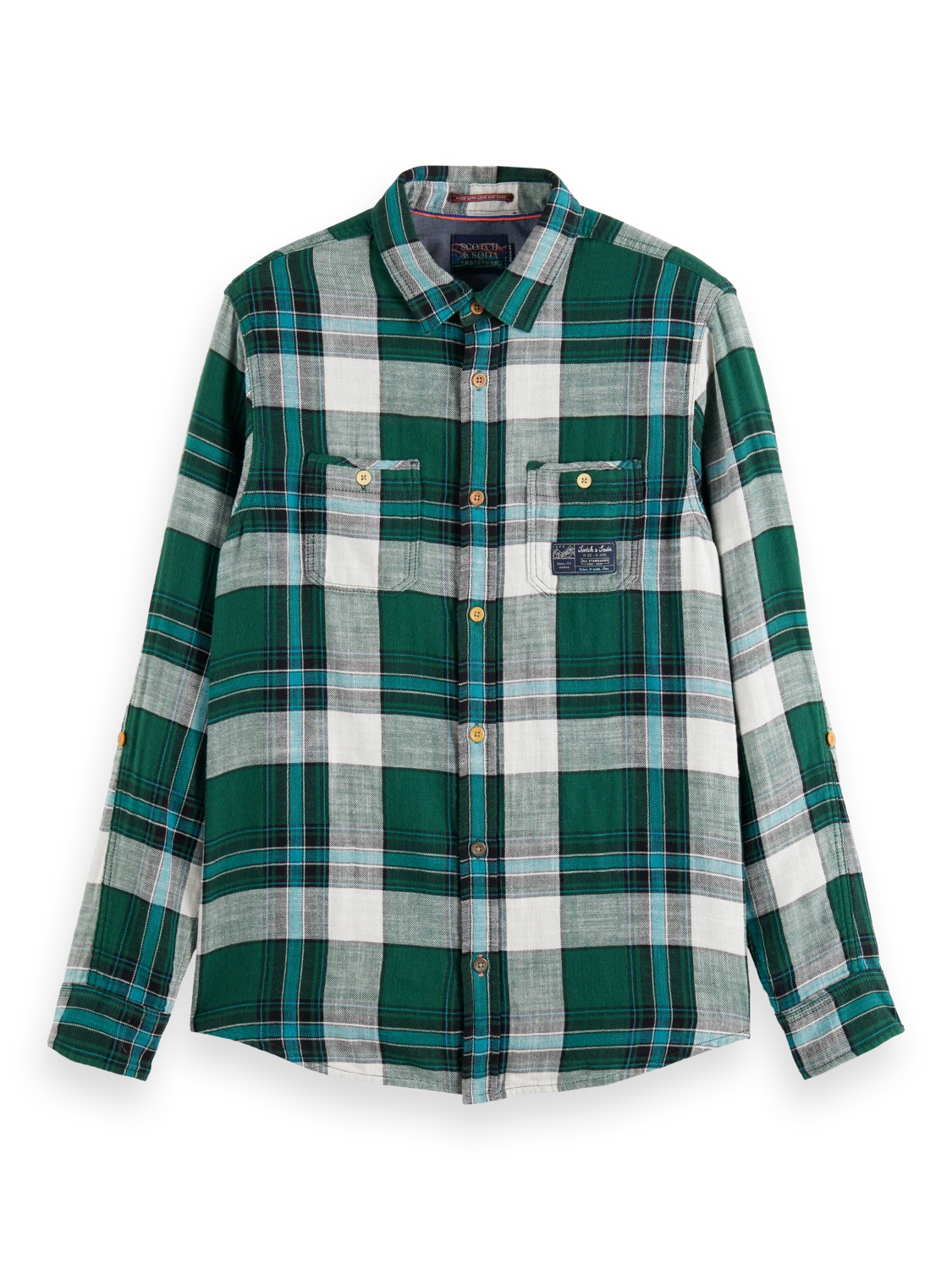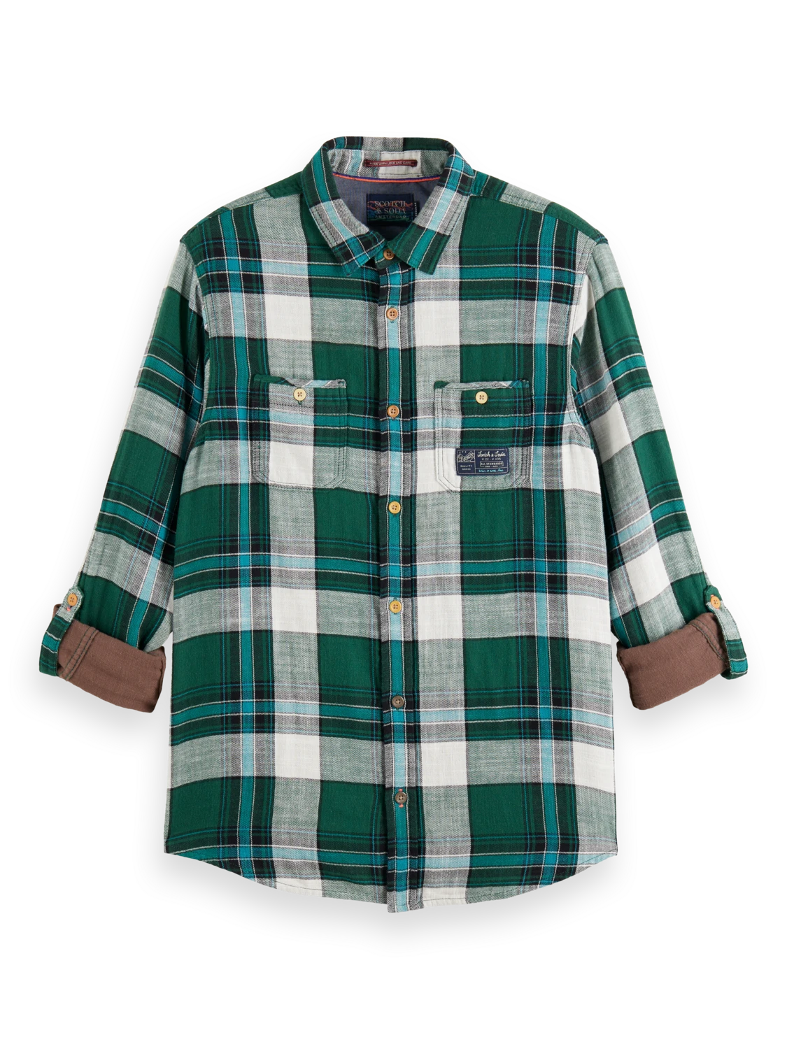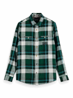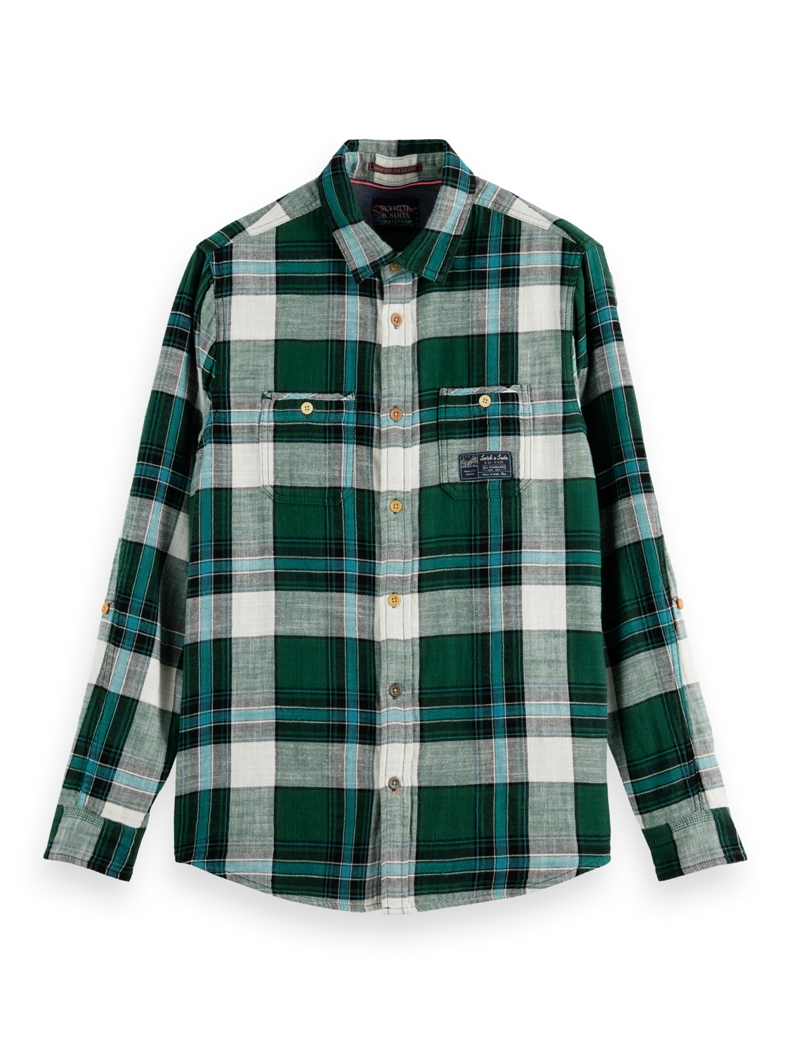 This cotton shirt comes adorned with an all-over checked contrasting plaid design, with two securable chest pockets. Featuring a cleverly hidden sleeve adjustment, simply roll up your sleeves and fasten to transform this style from a long-sleeve to elbow-length. Perfect for wearing on its own or layering.