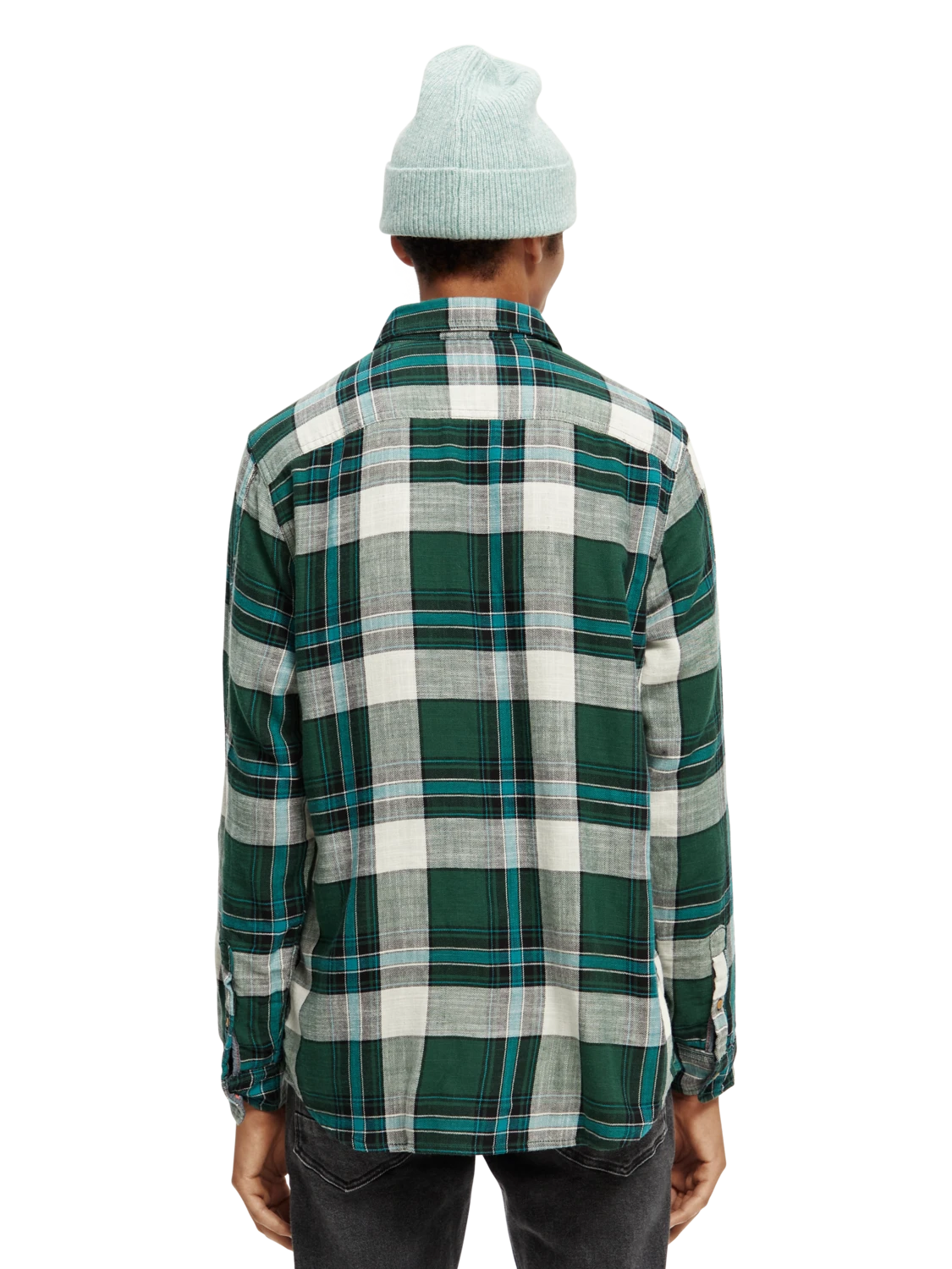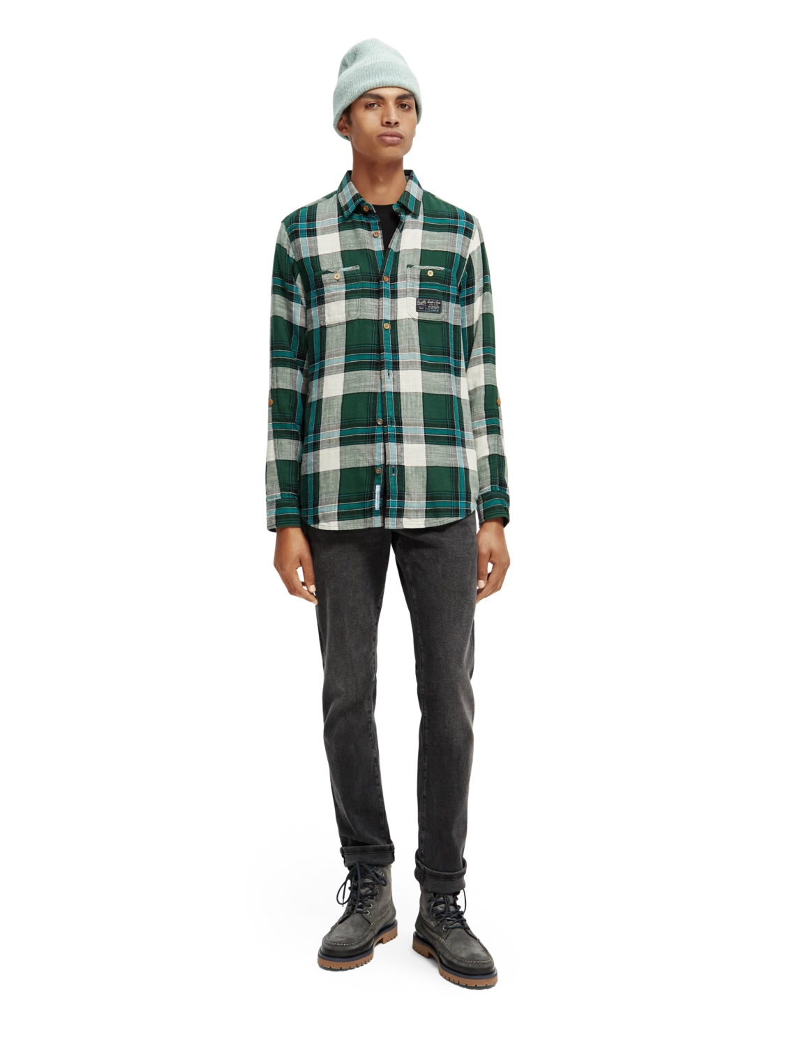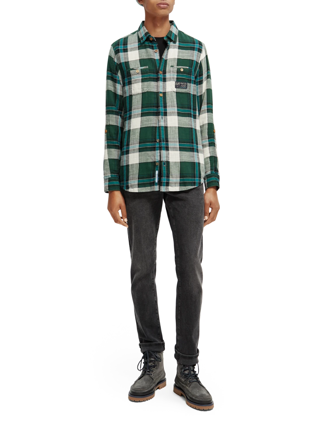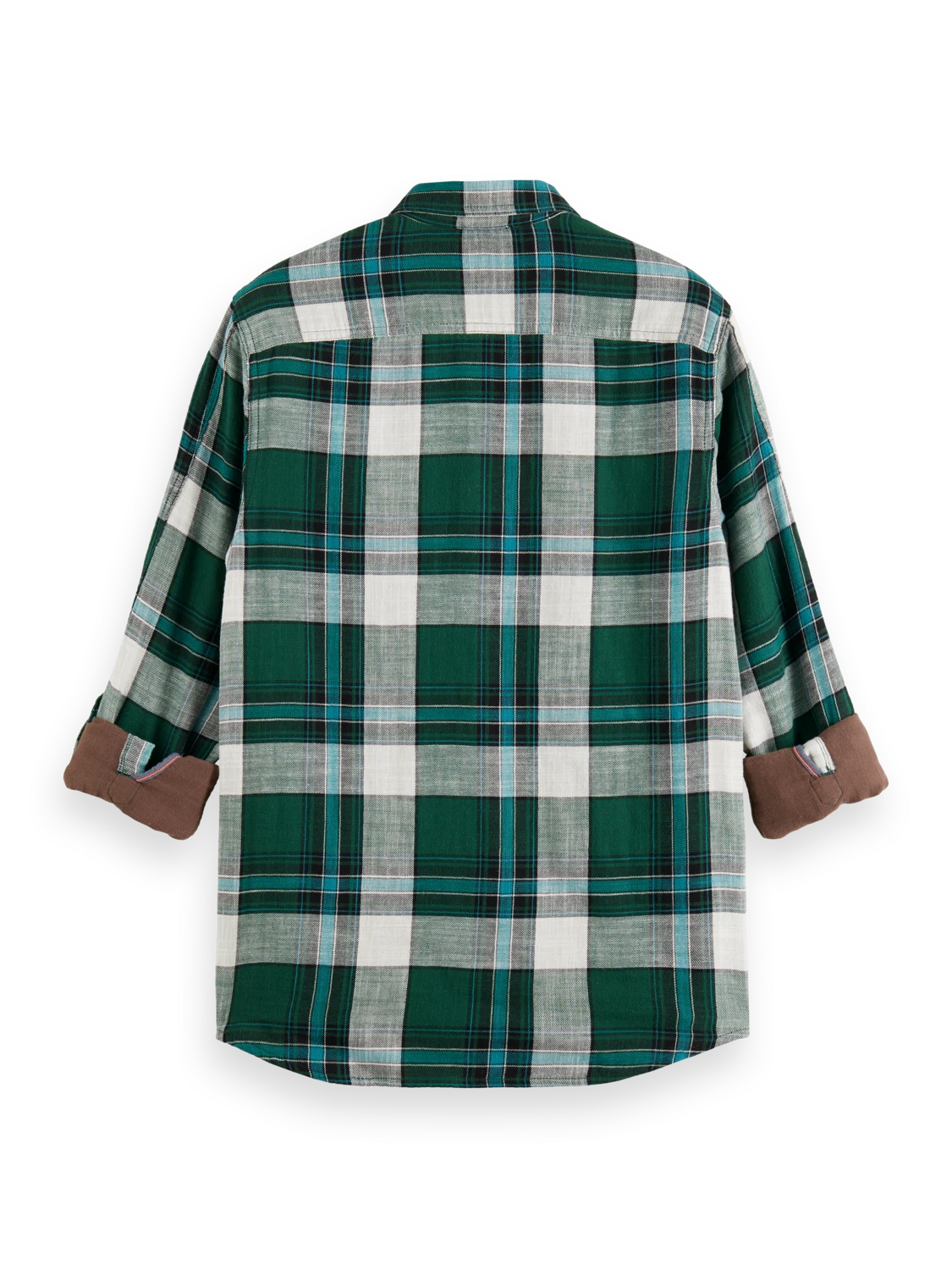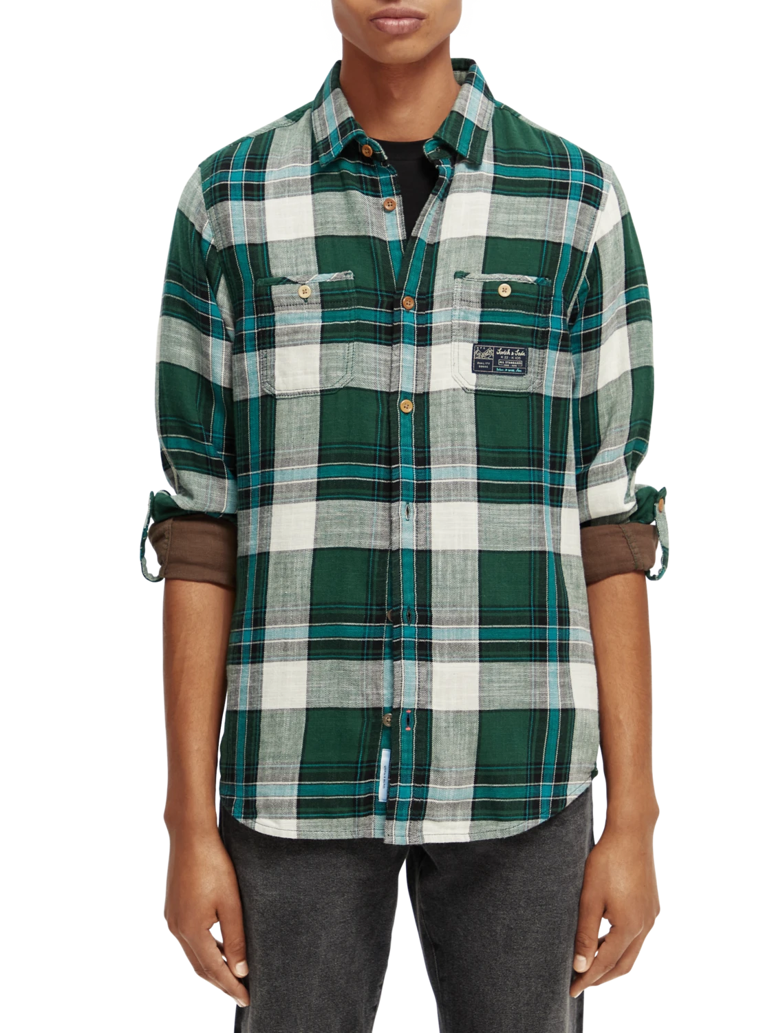 This cotton shirt comes adorned with an all-over checked contrasting plaid design, with two securable chest pockets. Featuring a cleverly hidden sleeve adjustment, simply roll up your sleeves and fasten to transform this style from a long-sleeve to elbow-length. Perfect for wearing on its own or layering.