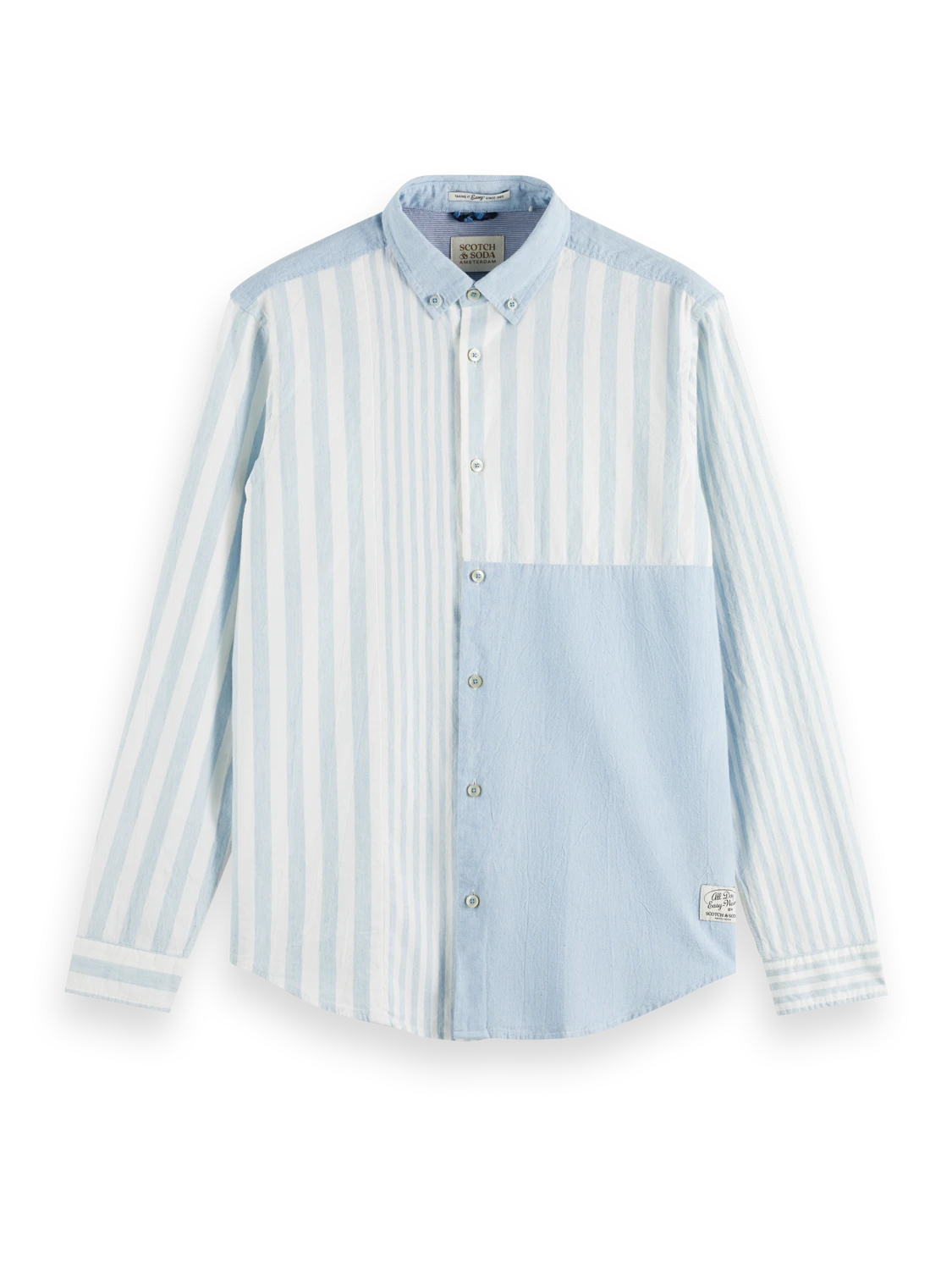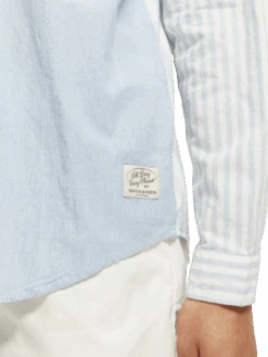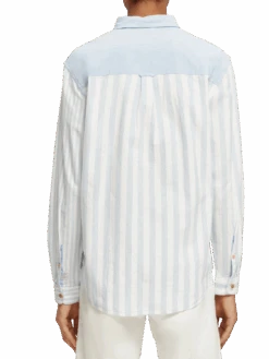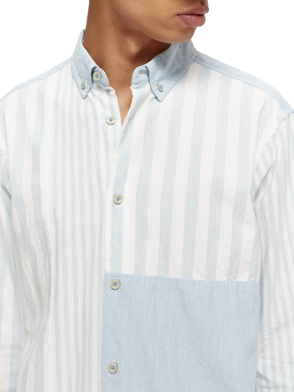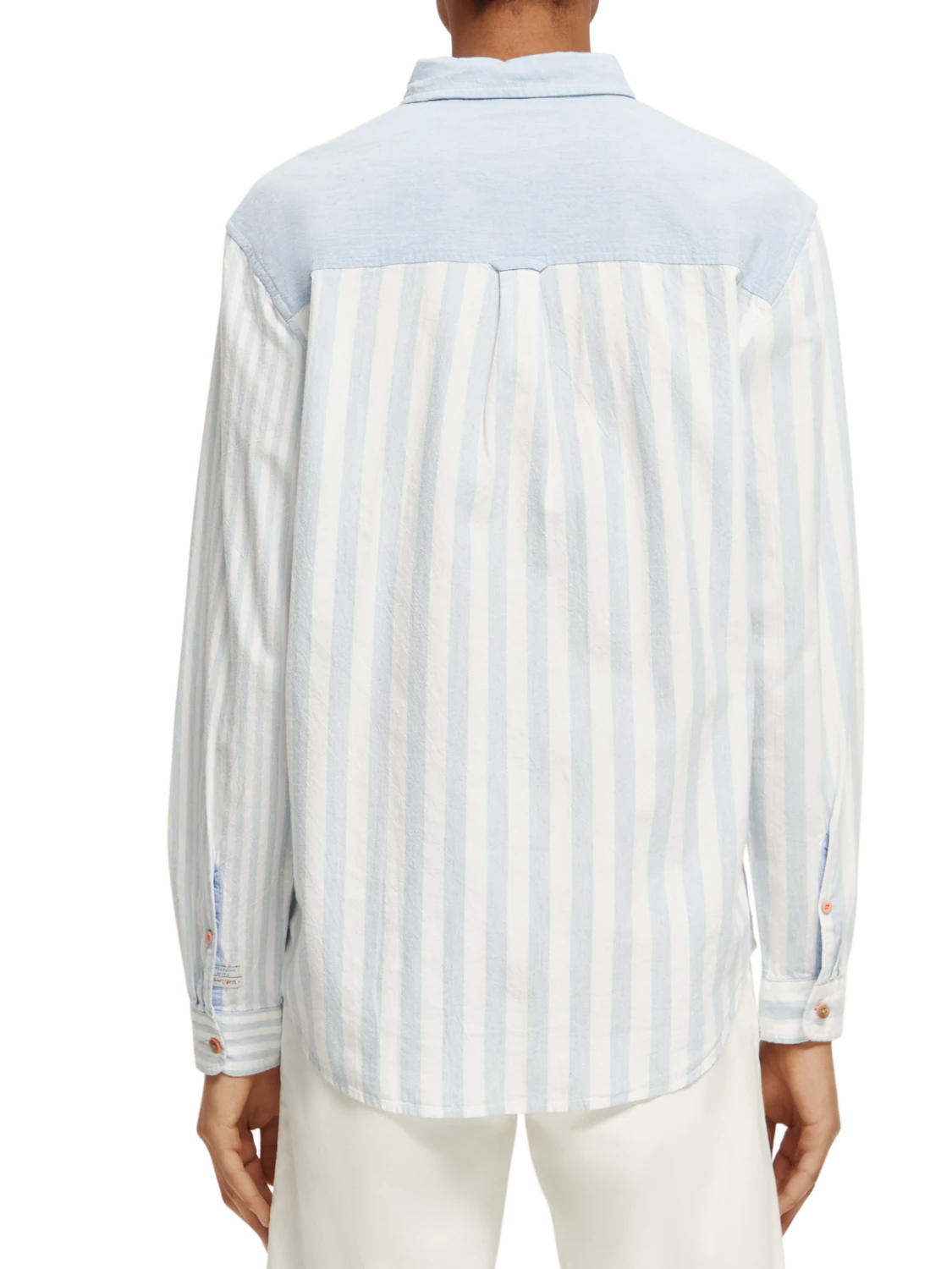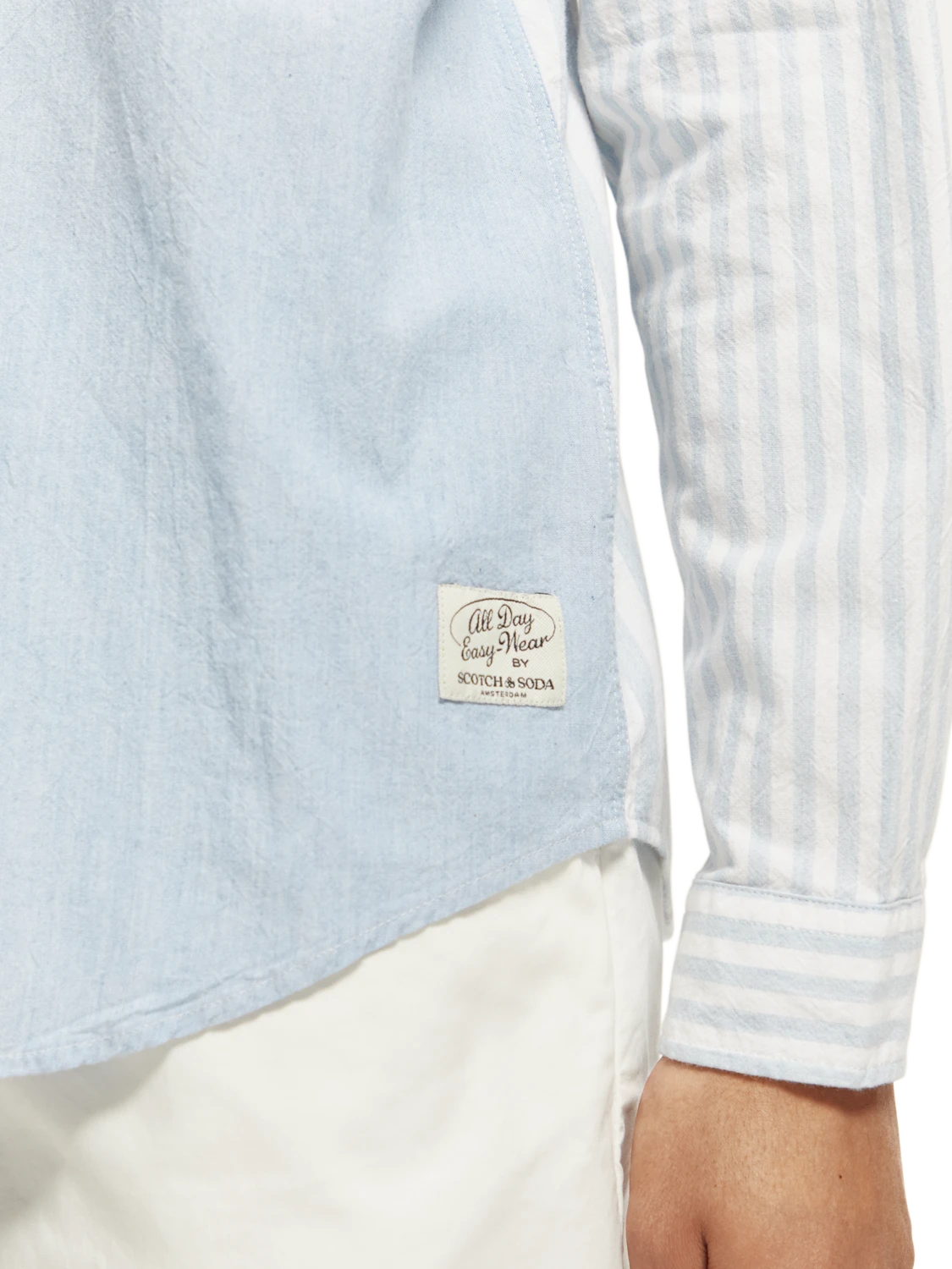 This classic chambray shirt comes with a fun mixed & match striped motif. Finished with a classic collar and full-length button closure, this shirt is a versatile style, ready to be worn for any occasion.