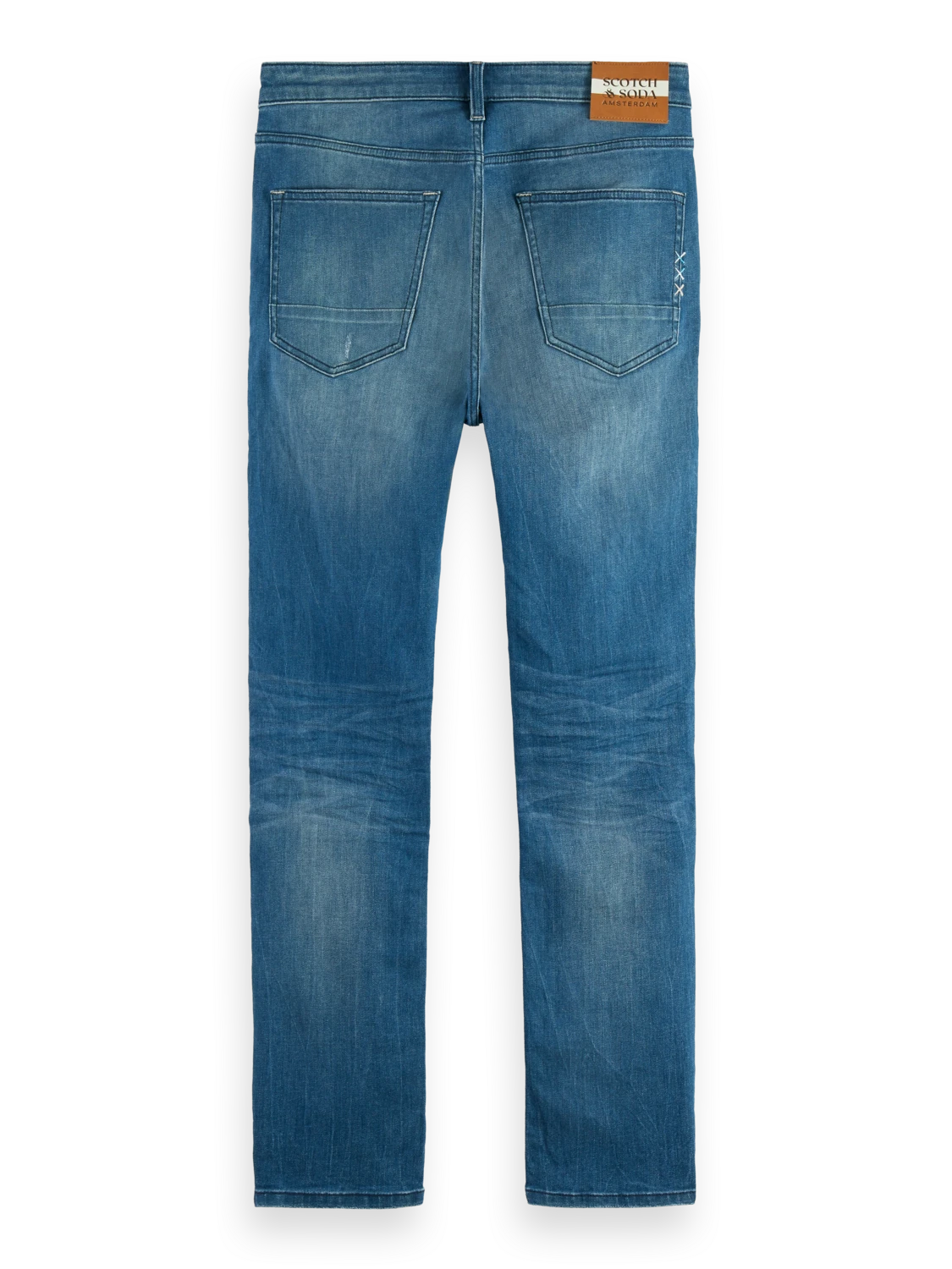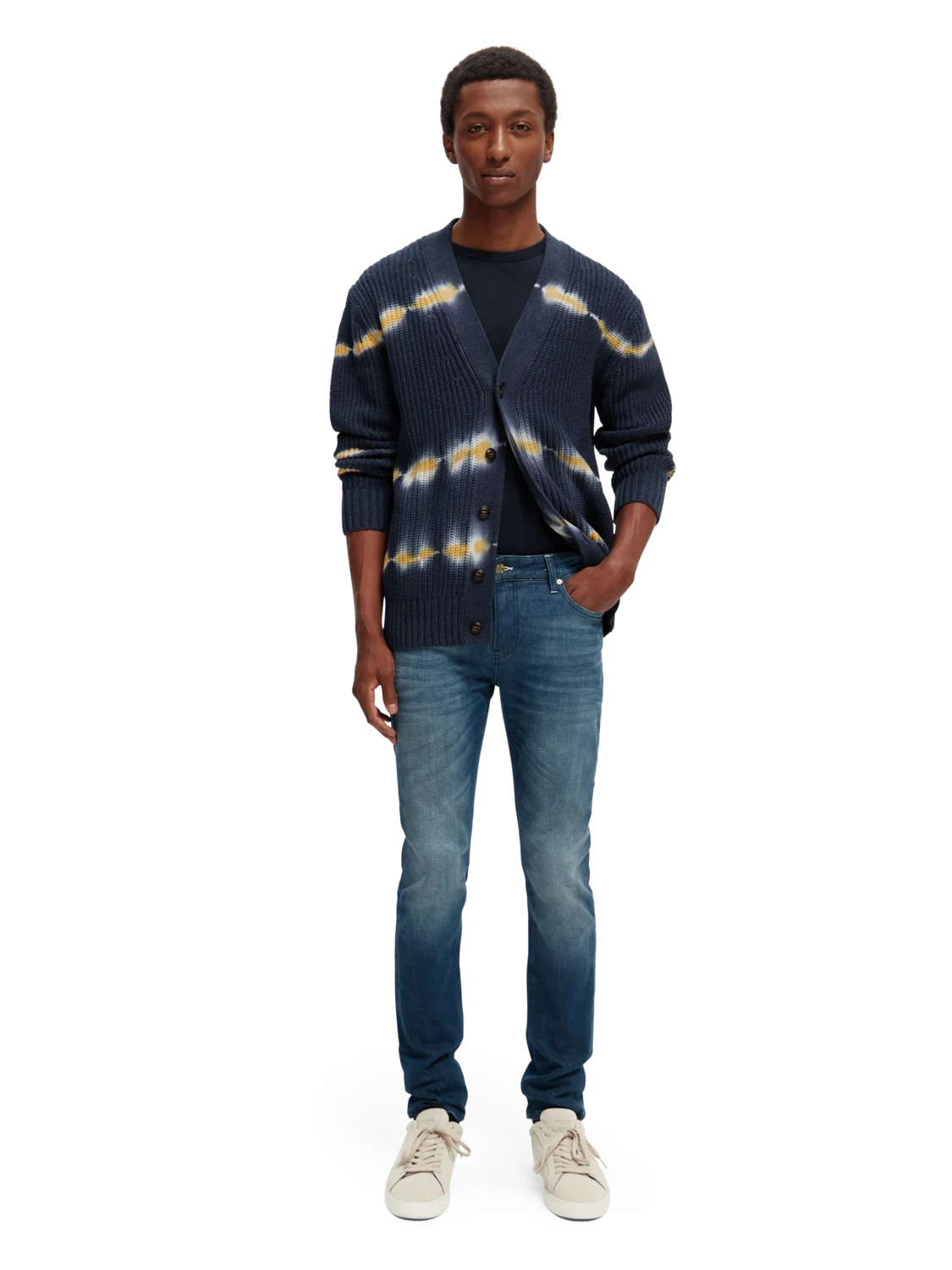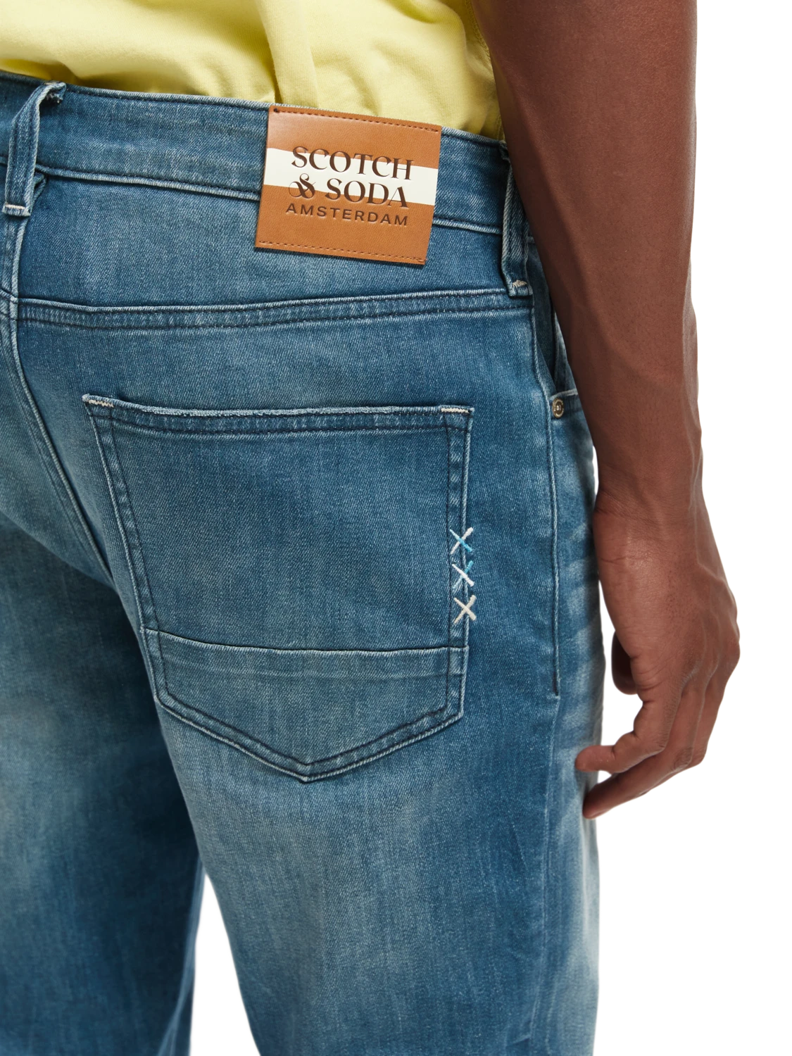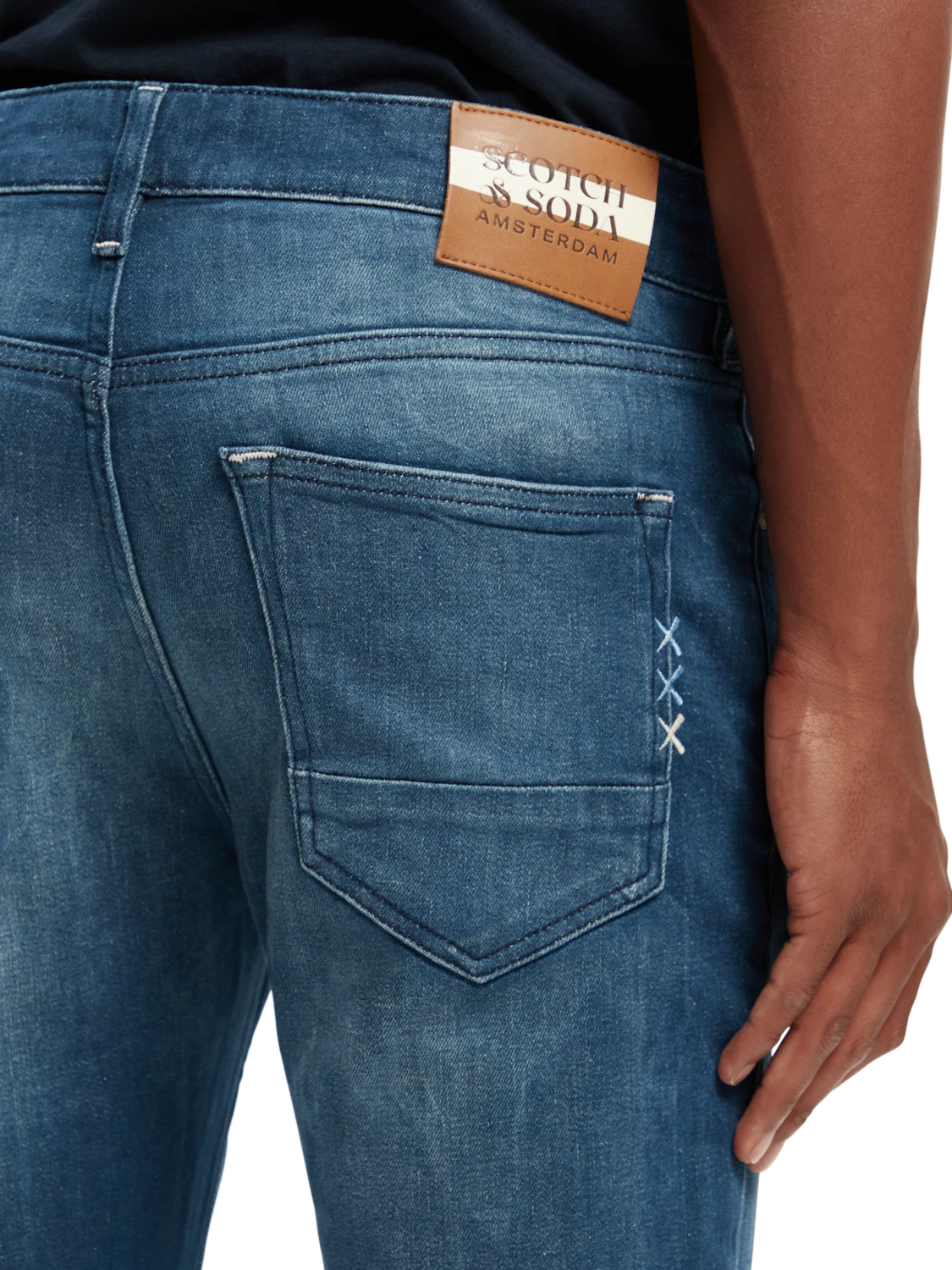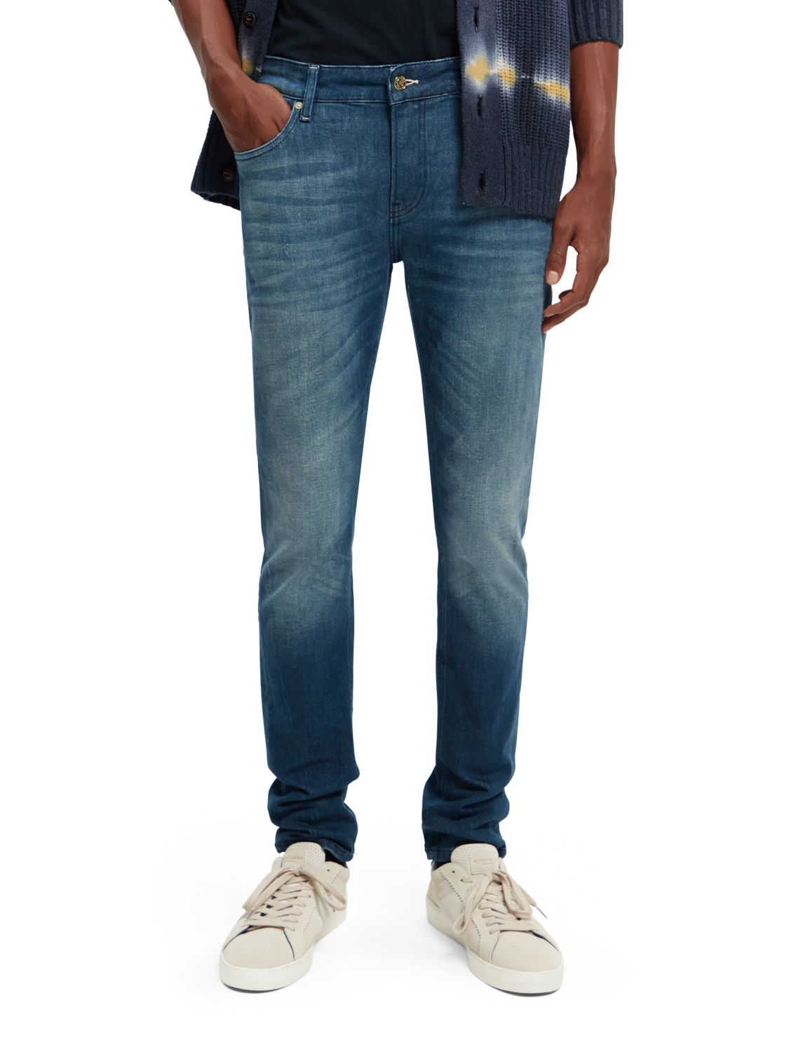 Cut super-slim, the Skim is form-fitting from waist to ankle. An infusion of elastane makes this skinny style comfortable throughout the day. Washed in a mid-blue tone with fading, finished with special coin rivet detailing and a zip fly.