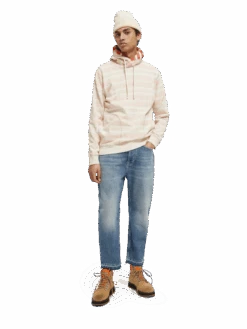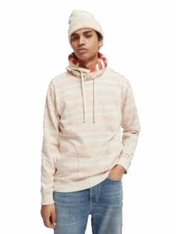 The twisted-hood and striped pattern detail makes this brushed felpa hoodie stand out from the rest. Featuring a Scotch & Soda logo on the hood and an embroidered message just above the left cuff. This comfortable hoodie is made from 100% cotton and is outfitted with side pockets and a hood drawstring for easy adjustments.