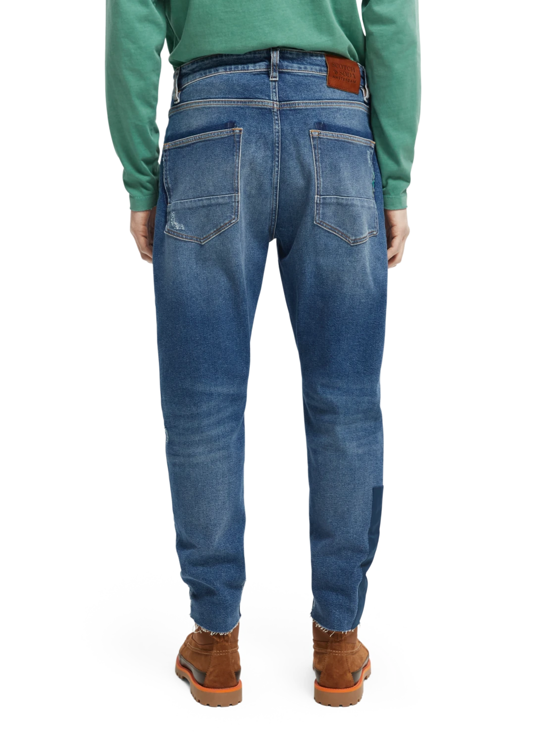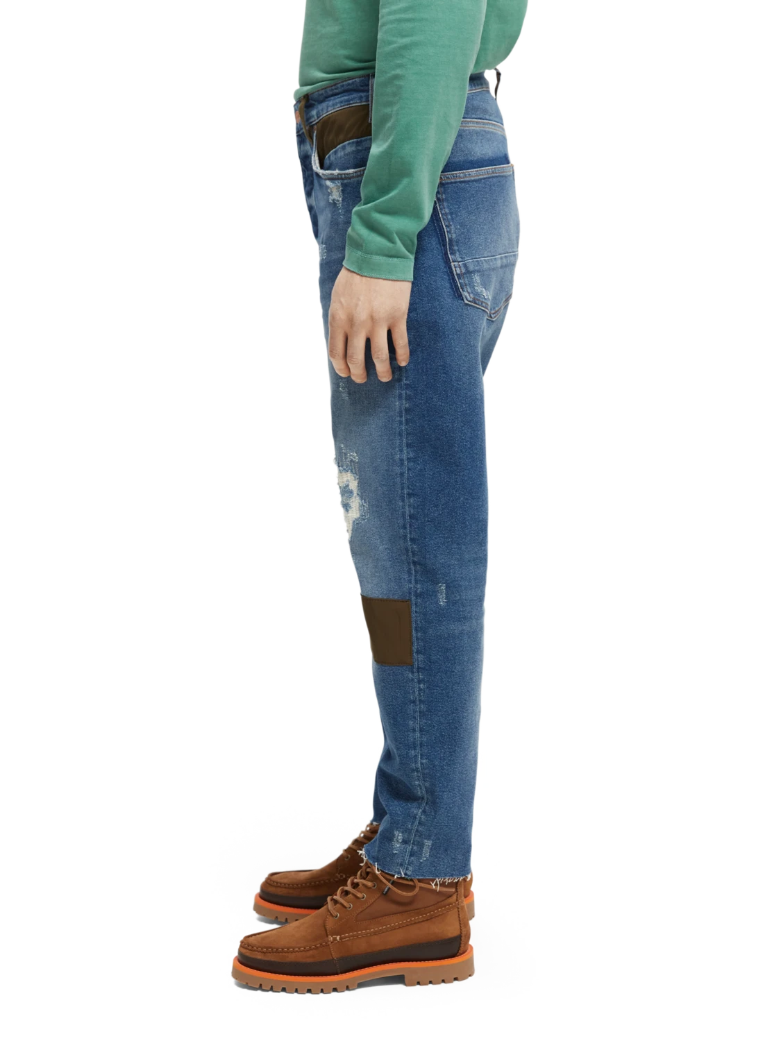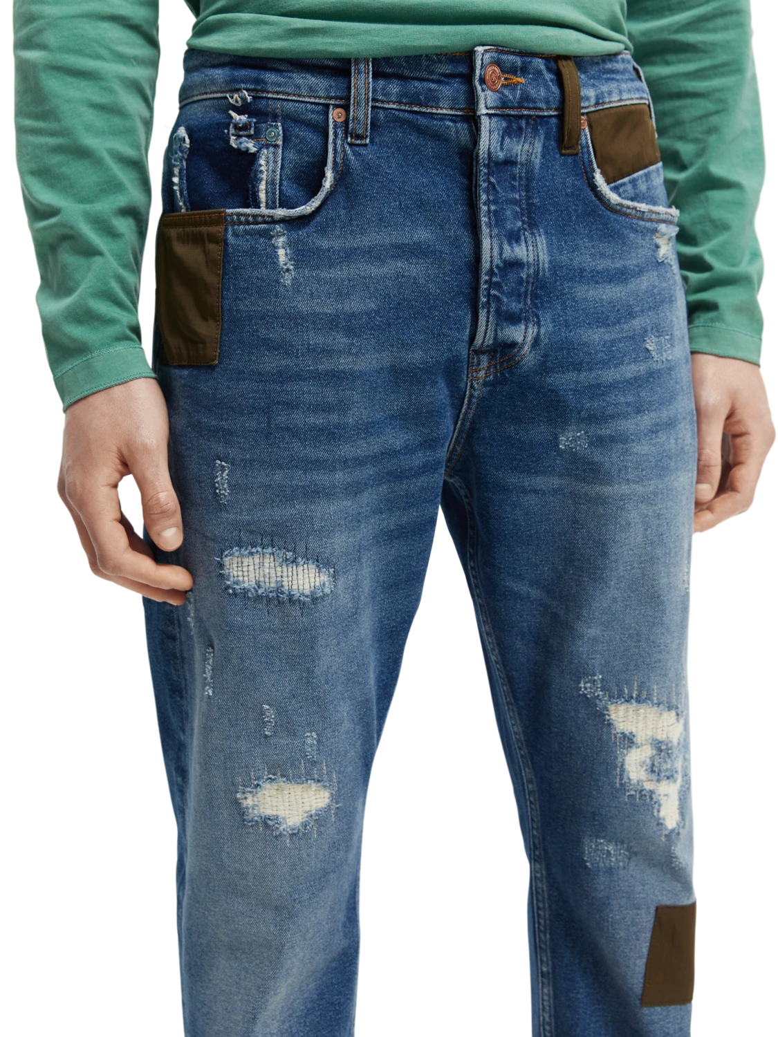 The Dean is our loose tapered-fit jean – with a wide-leg from hip to thigh that transitions into a more tailored ankle. Washed in a mid-blue tone with patchwork and distressed detailing, this relaxed style is finished with large back pockets and a button fly.