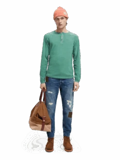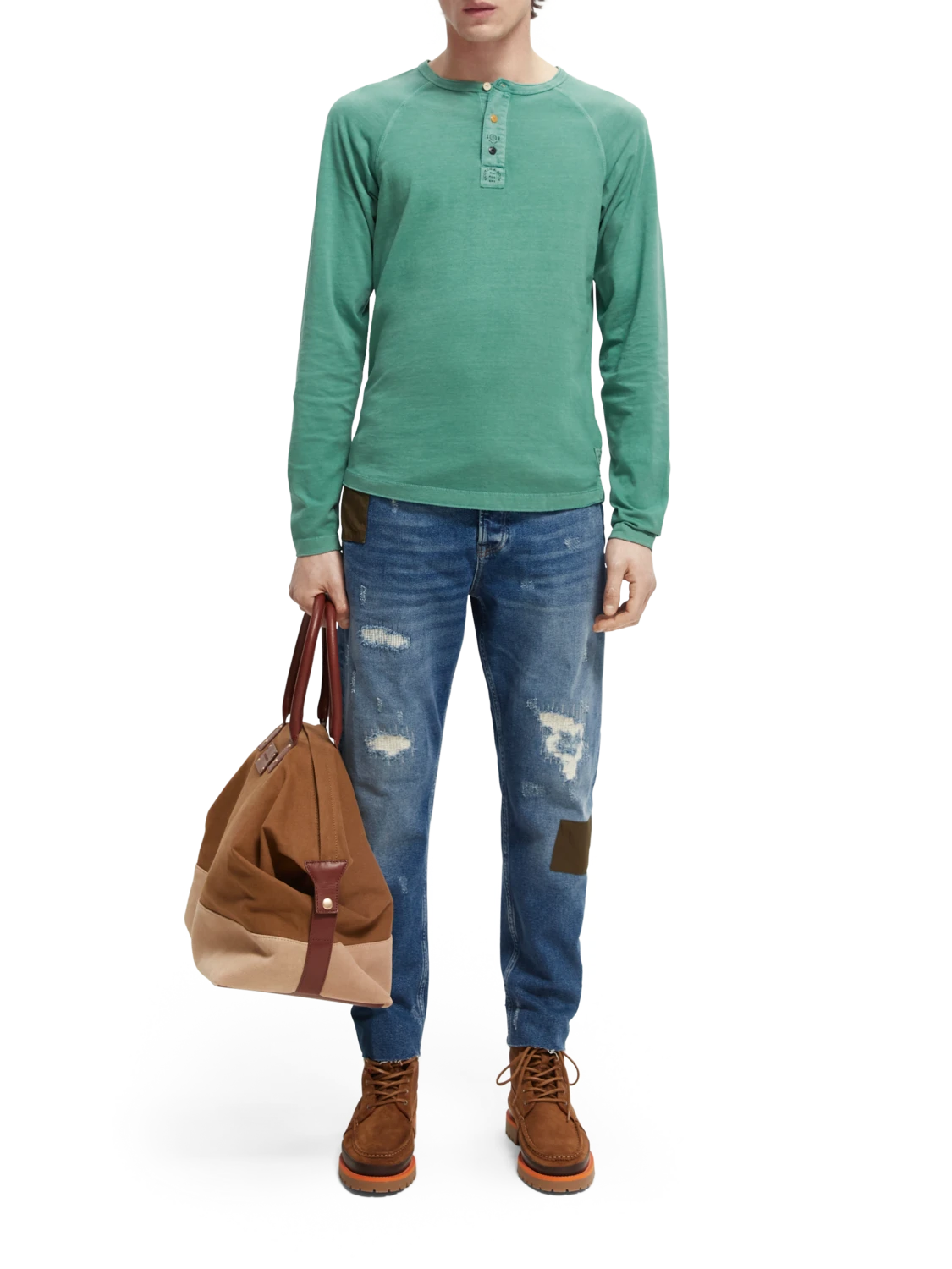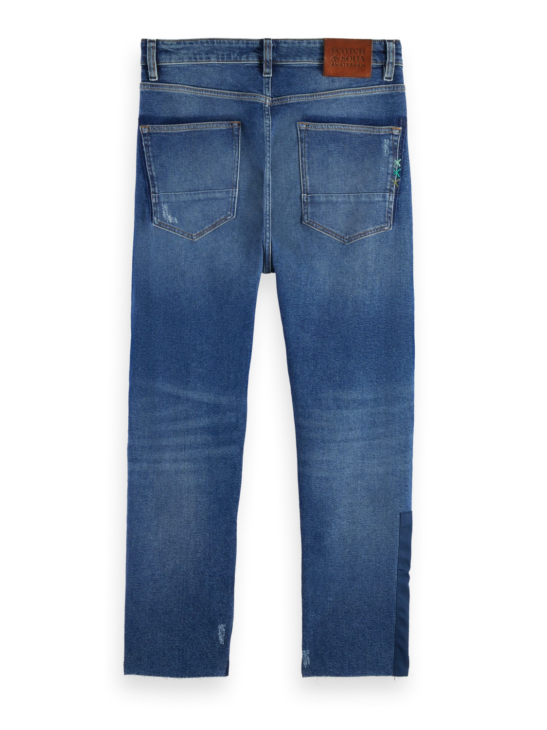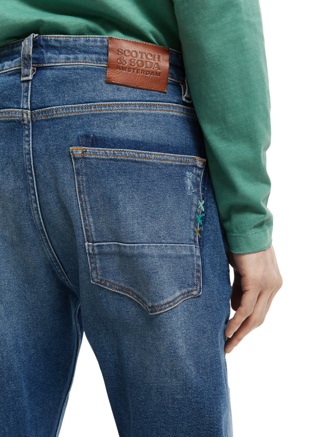 The Dean is our loose tapered-fit jean – with a wide-leg from hip to thigh that transitions into a more tailored ankle. Washed in a mid-blue tone with patchwork and distressed detailing, this relaxed style is finished with large back pockets and a button fly.