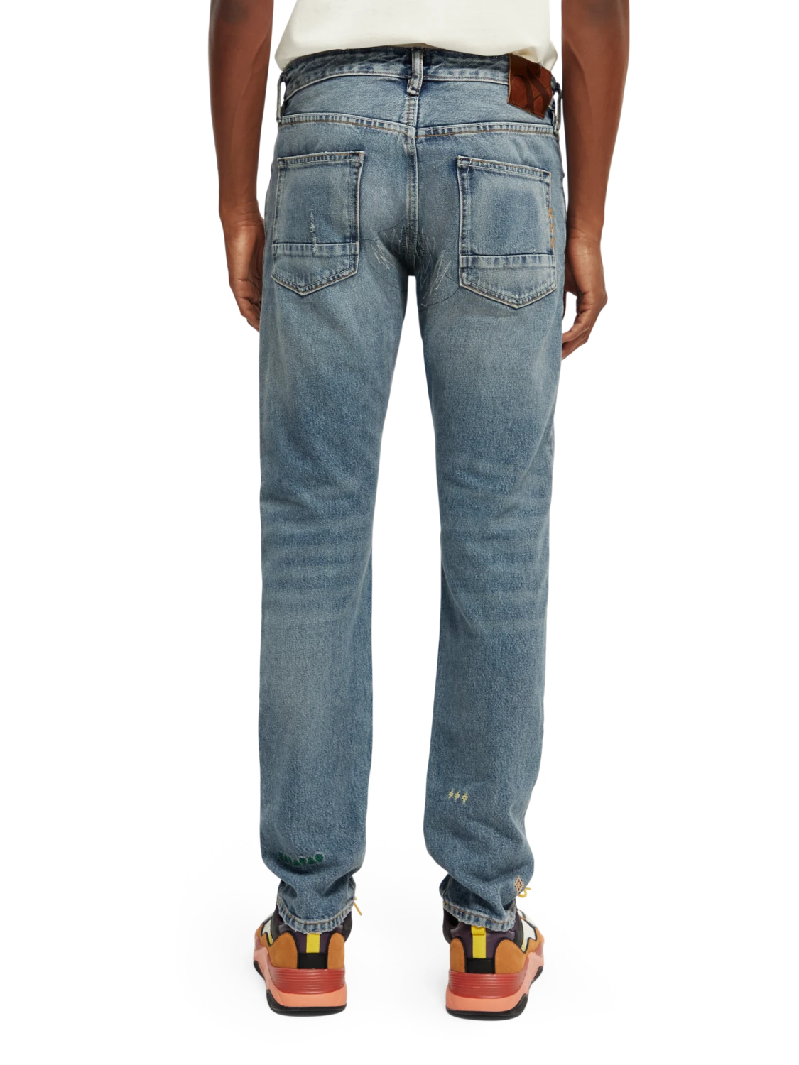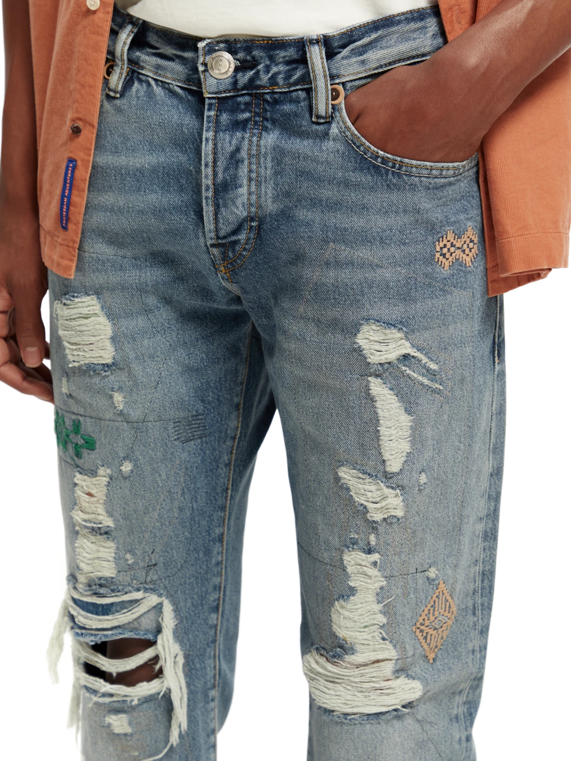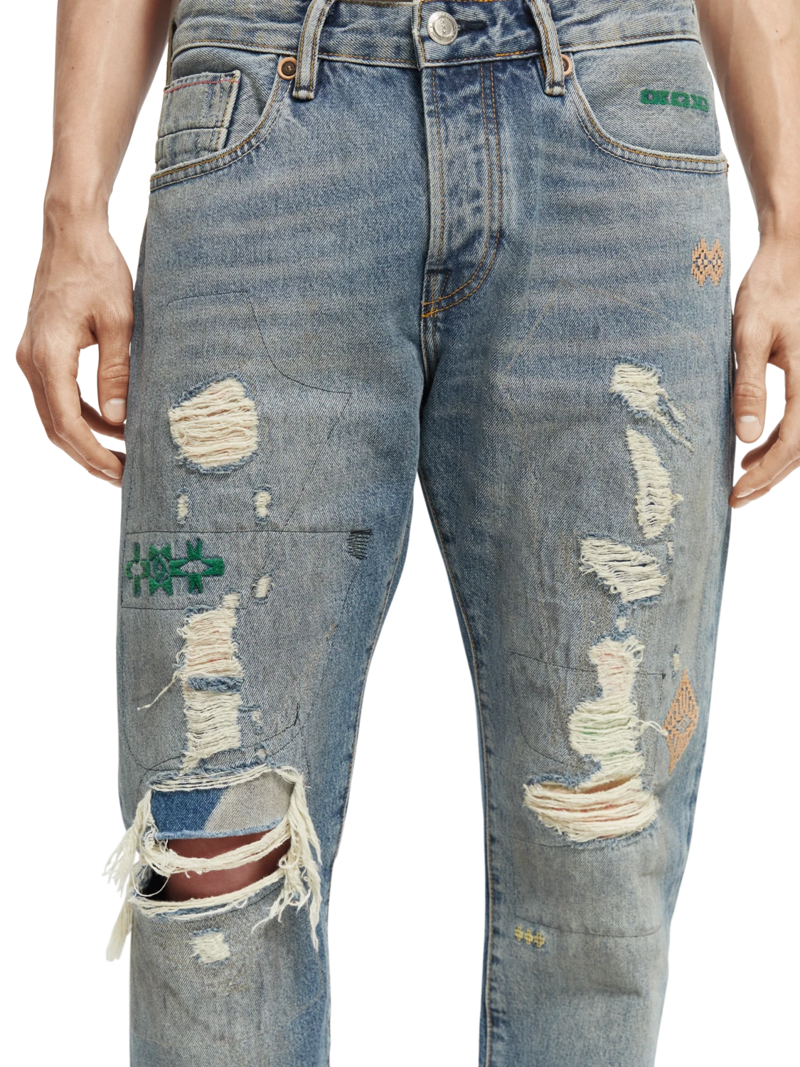 The Ralston is an iconic long-standing favourite. Cut for a regular slim fit – a hint of elastane gives a comfortable, relaxed feel. Our latest take has distressed features and ikat patterning and is washed in a mid-blue tone – complemented by the button fly and stylistic detail at the coin rivet.
