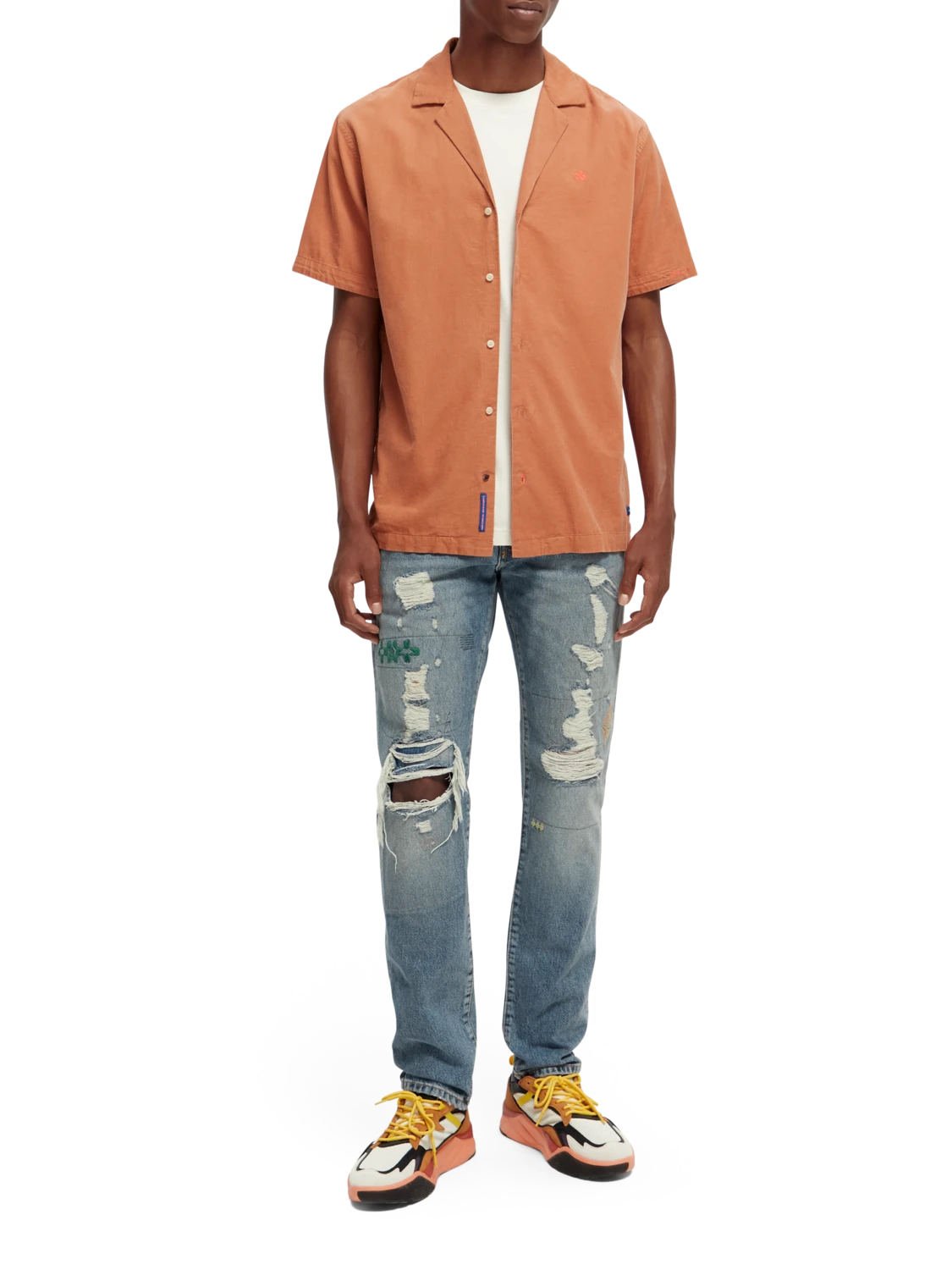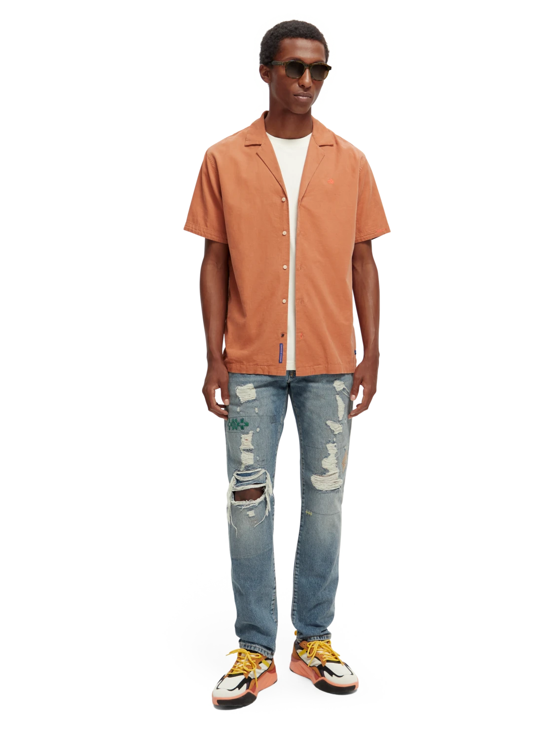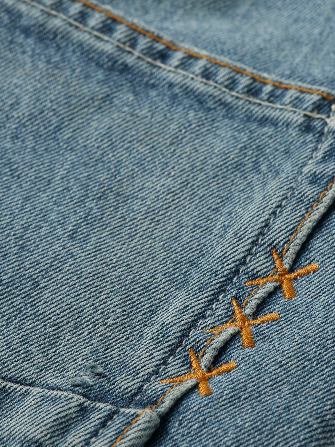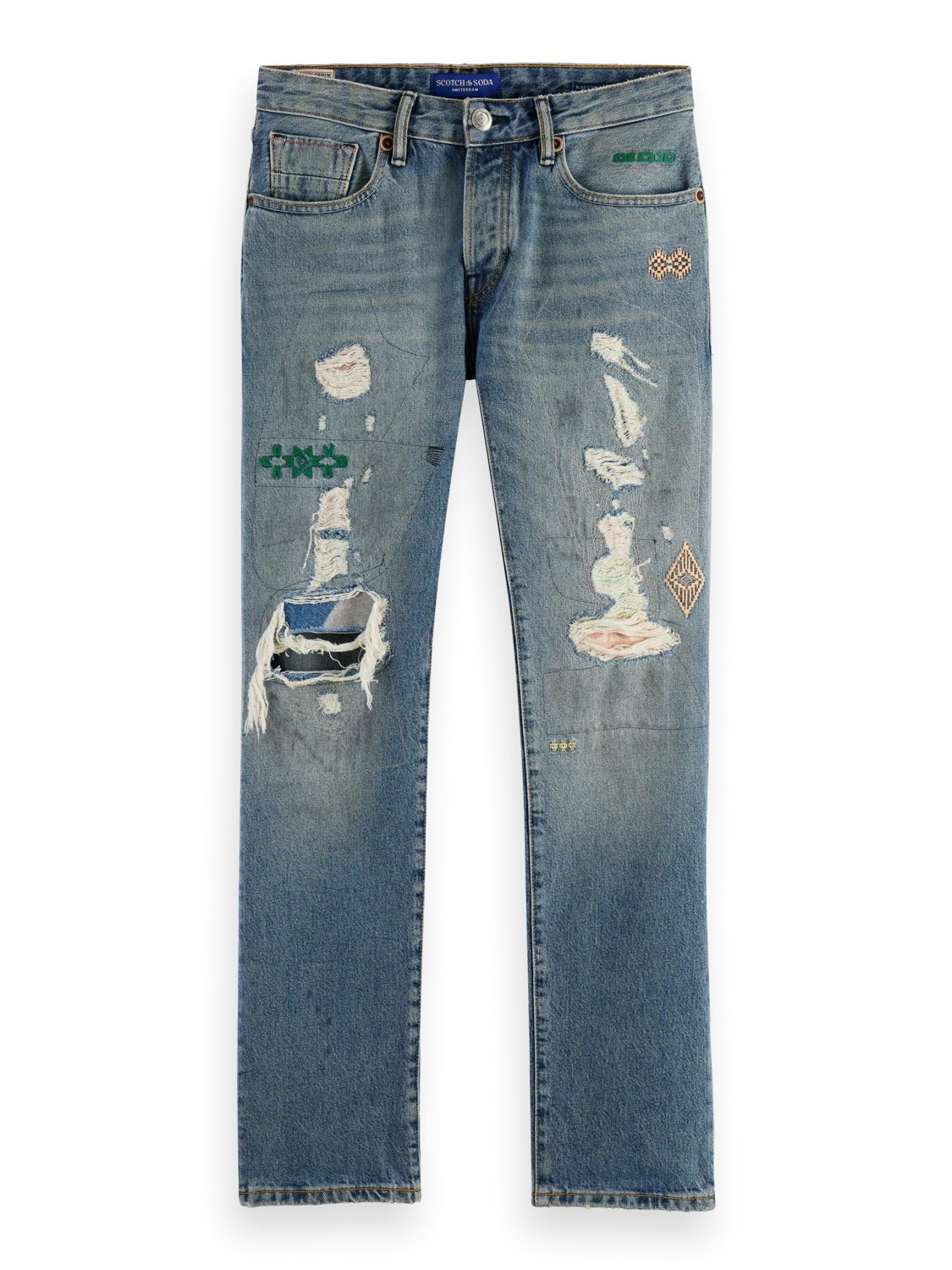 The Ralston is an iconic long-standing favourite. Cut for a regular slim fit – a hint of elastane gives a comfortable, relaxed feel. Our latest take has distressed features and ikat patterning and is washed in a mid-blue tone – complemented by the button fly and stylistic detail at the coin rivet.