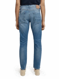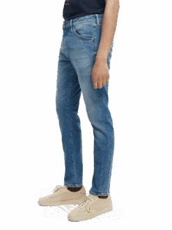 The Singel is named after one of Amsterdam’s most famous canals. Cut with a slim fit, darts on the calf give tapering down to the ankle. Washed in a classic mid-blue tone, complete with a multi-coloured button fly and angled pockets.