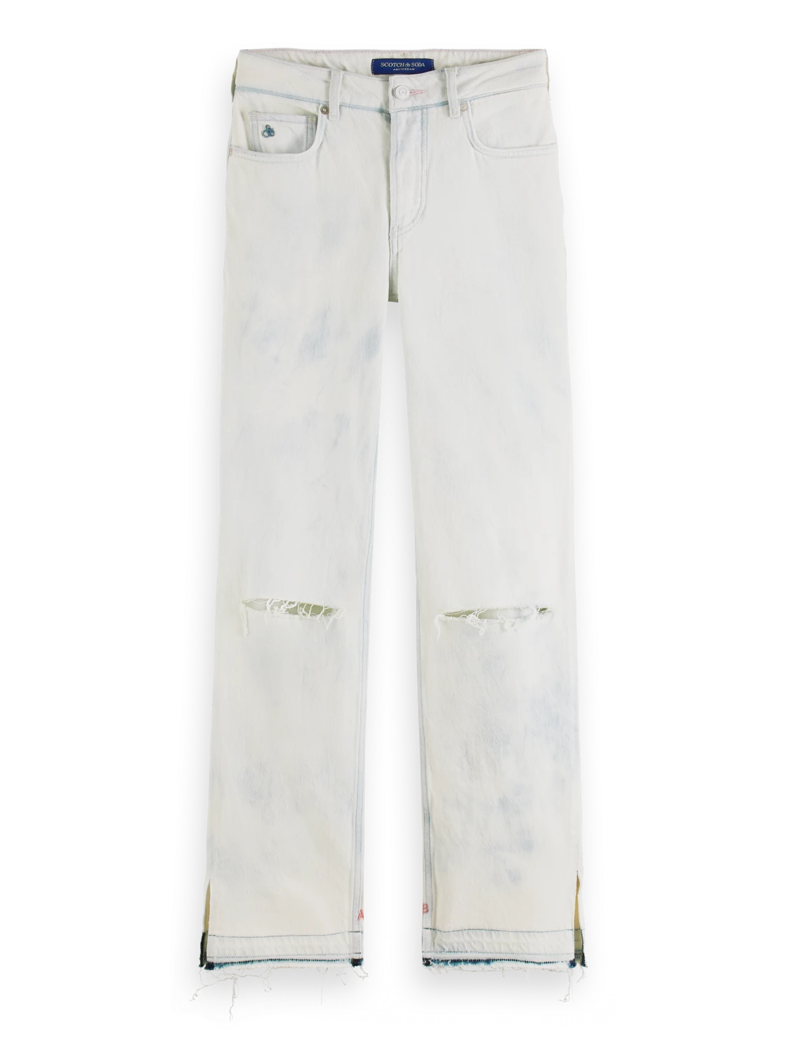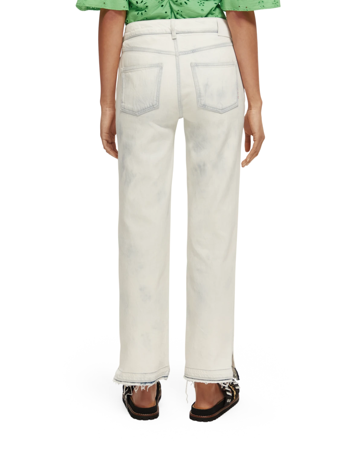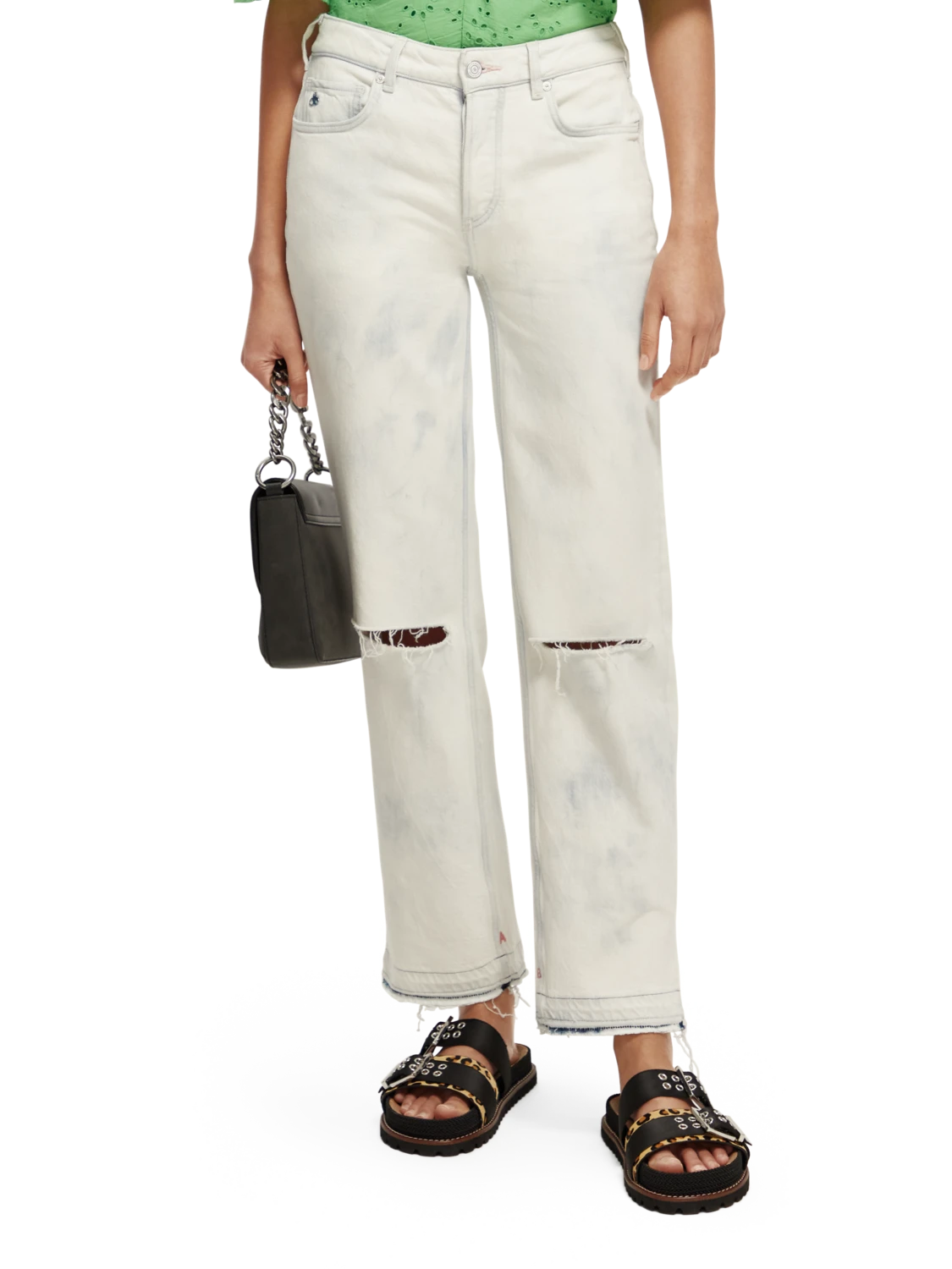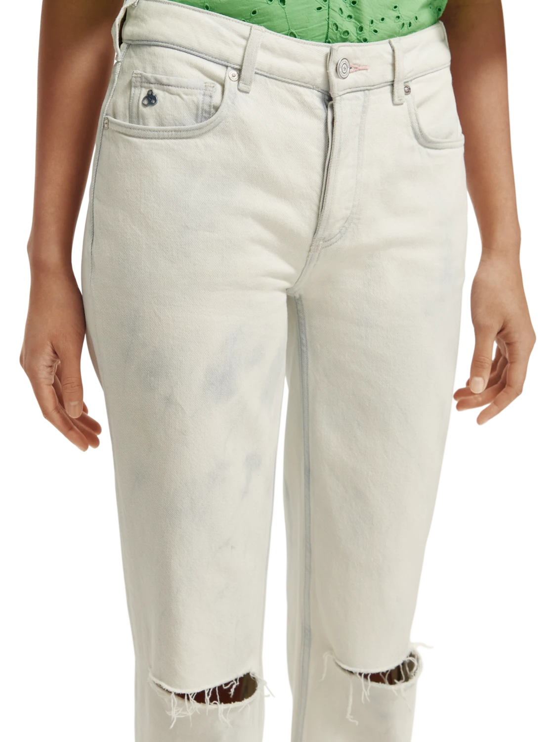 The Sky has a straight leg fit that sits high on the waist and ends just above the ankle. Featuring contrast accenting with fraying at the hems and stylistic damage at the knees, this style has refined pocket detailing and a button fly.