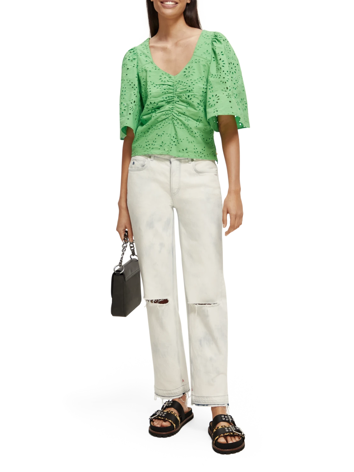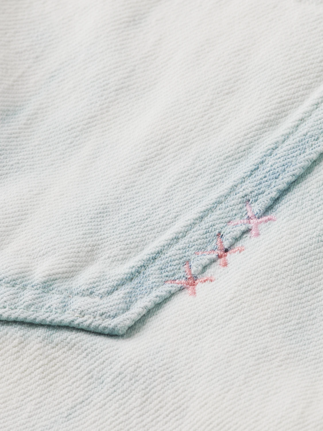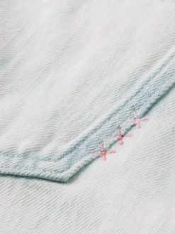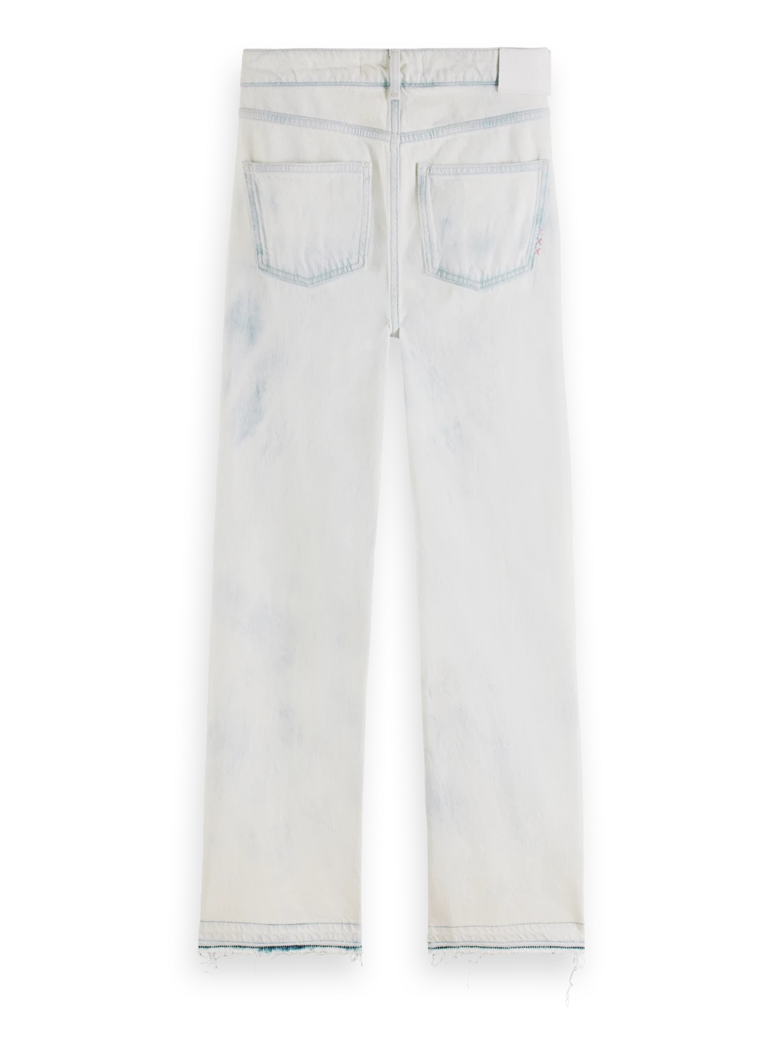 The Sky has a straight leg fit that sits high on the waist and ends just above the ankle. Featuring contrast accenting with fraying at the hems and stylistic damage at the knees, this style has refined pocket detailing and a button fly.