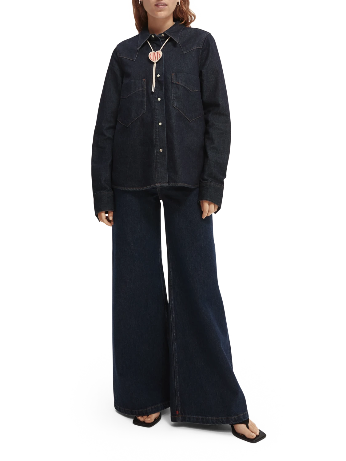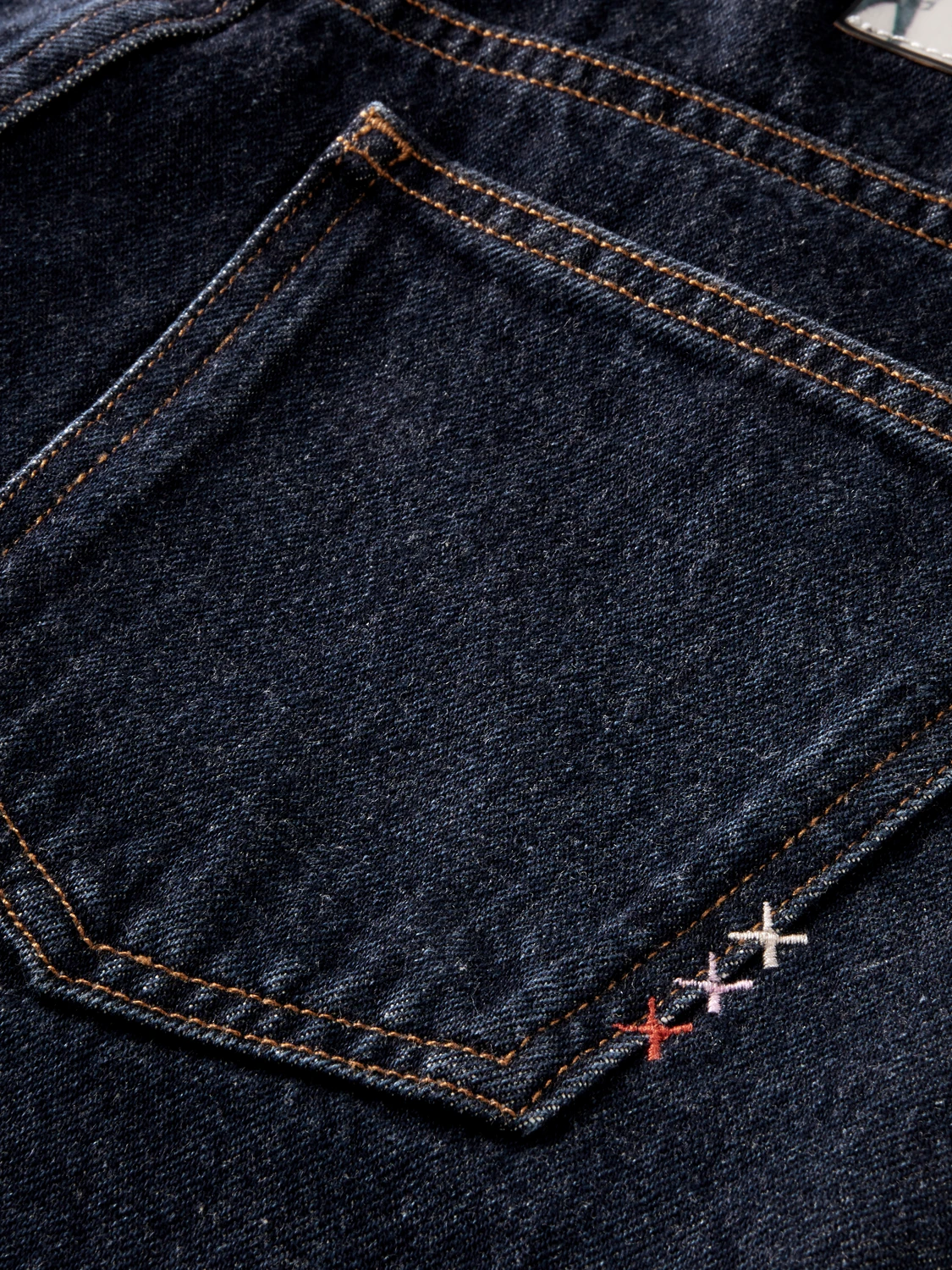 Let’s catch some waves. This seasonal high rise wide-leg denim is made in a beautiful ecru non-stretch fabric. Featuring the Elvis embroidery on the back pocket and specially developed trims, it’s everything you need to look awesome while you dance. Or while you stand. Complete the look with the Elvis trucker jacket. Made with organic cotton: non-GMO seeds are grown on land free from pesticides and synthetic fertilisers, lower water use, and farmed using crop rotation which is better for soil health.