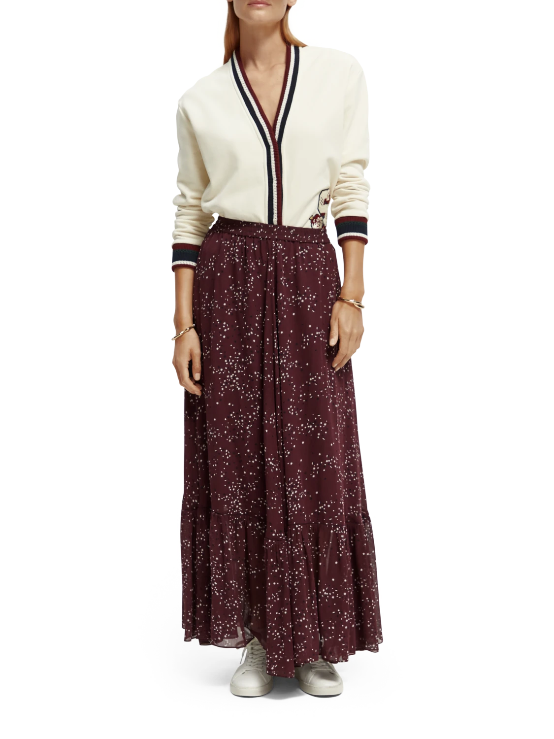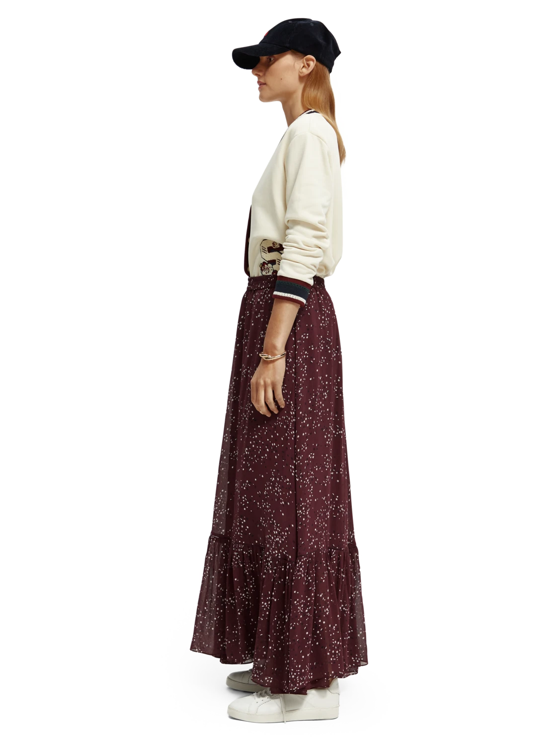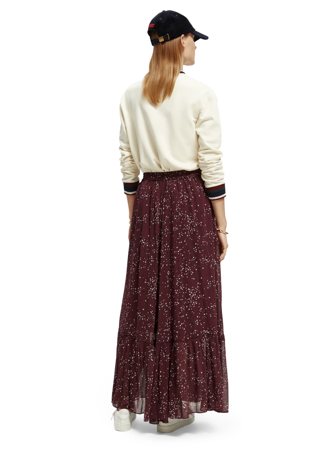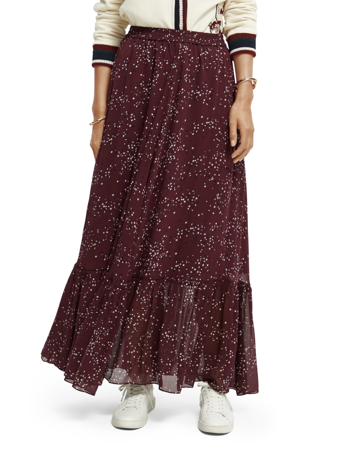 This maxi length skirt comes in a soft chiffon, adorned with an eye-catching print. Finished with a single tier with gathering details giving an added dimension to this versatile style.