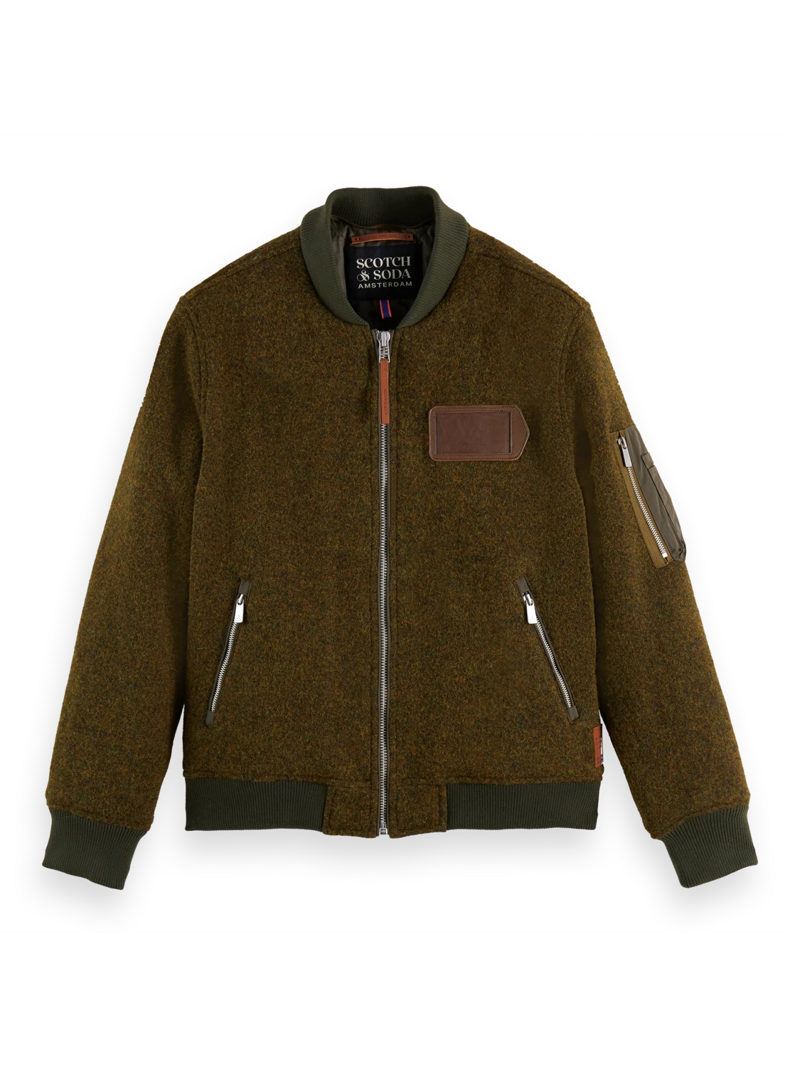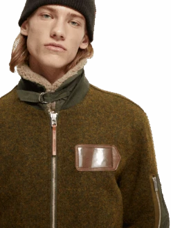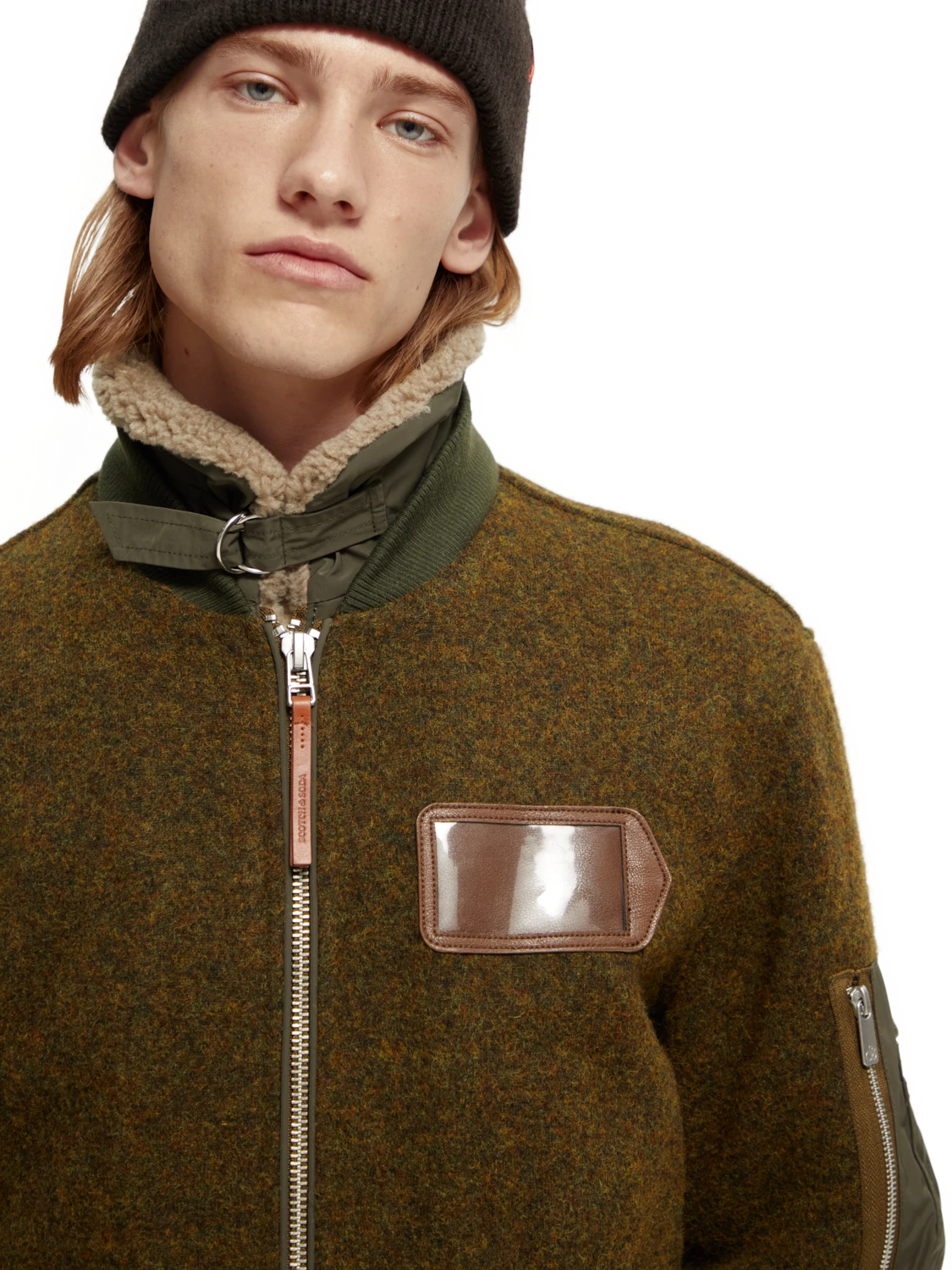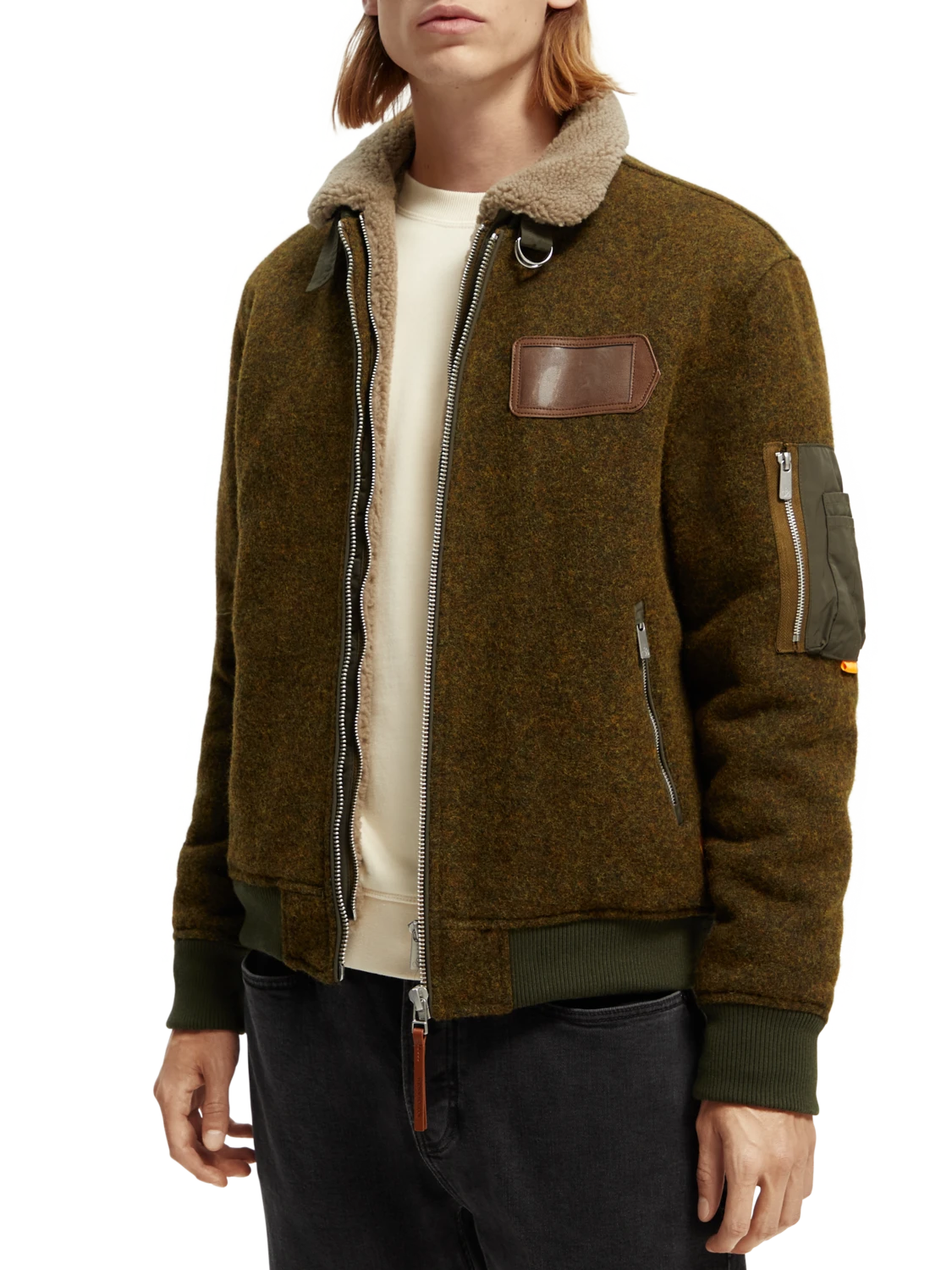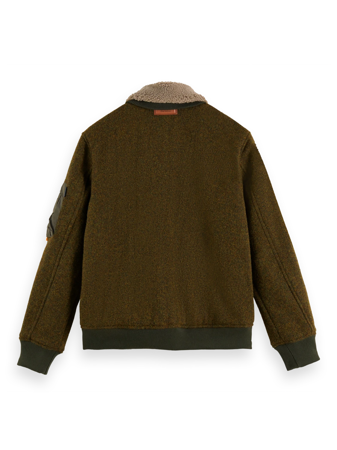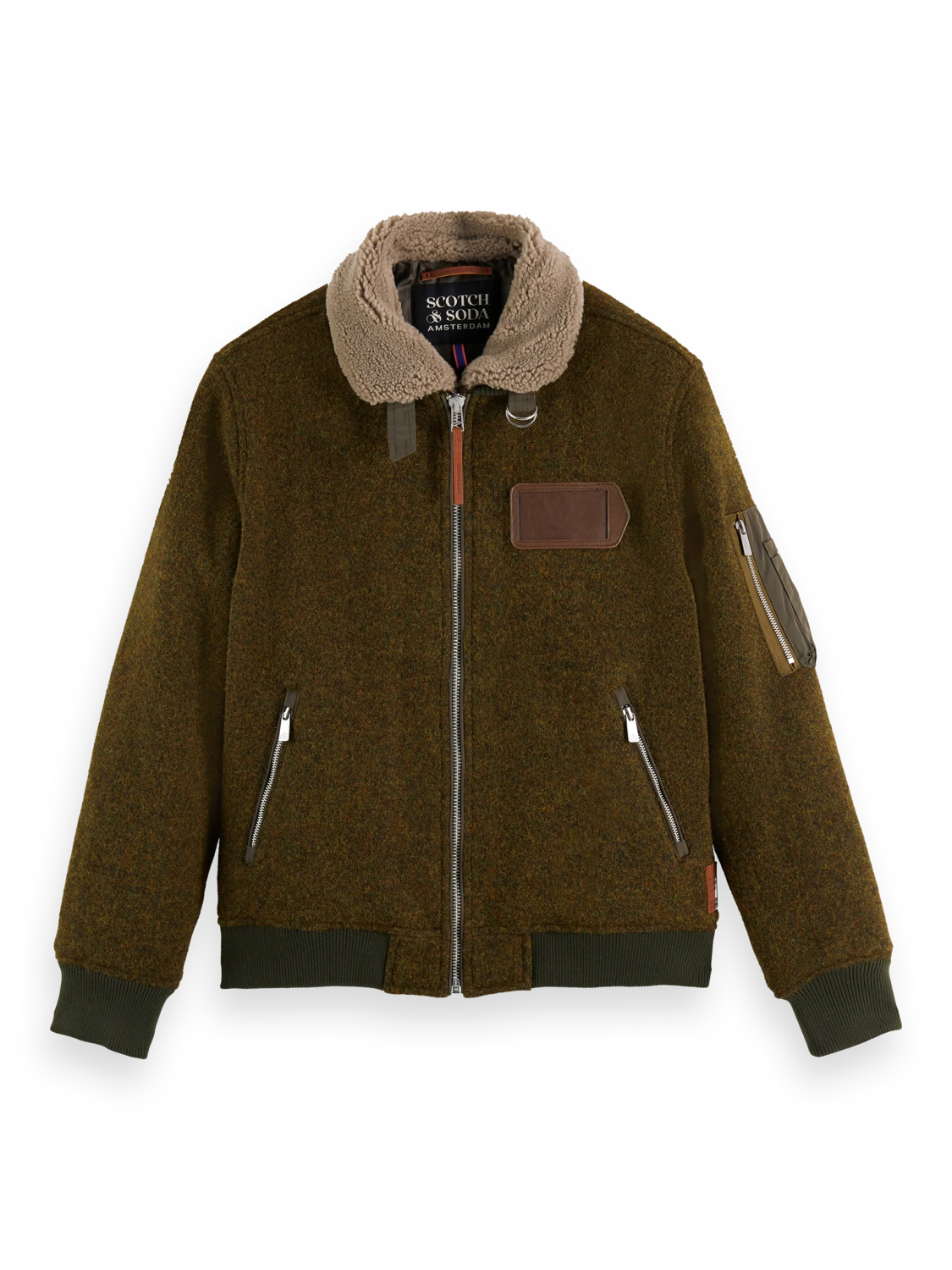 The bomber jacket is a proven style, popular across generations. Made from a wool (70%) blend, teddy color, finished with a ribbed hem and cuff .