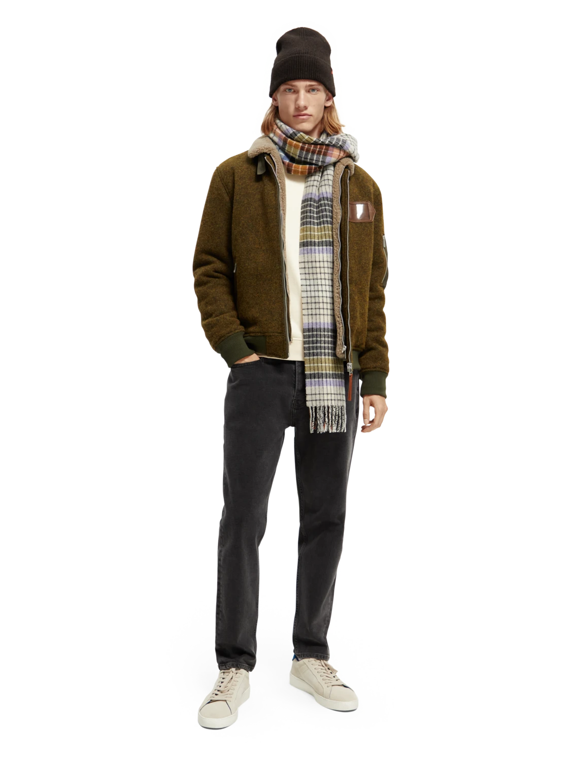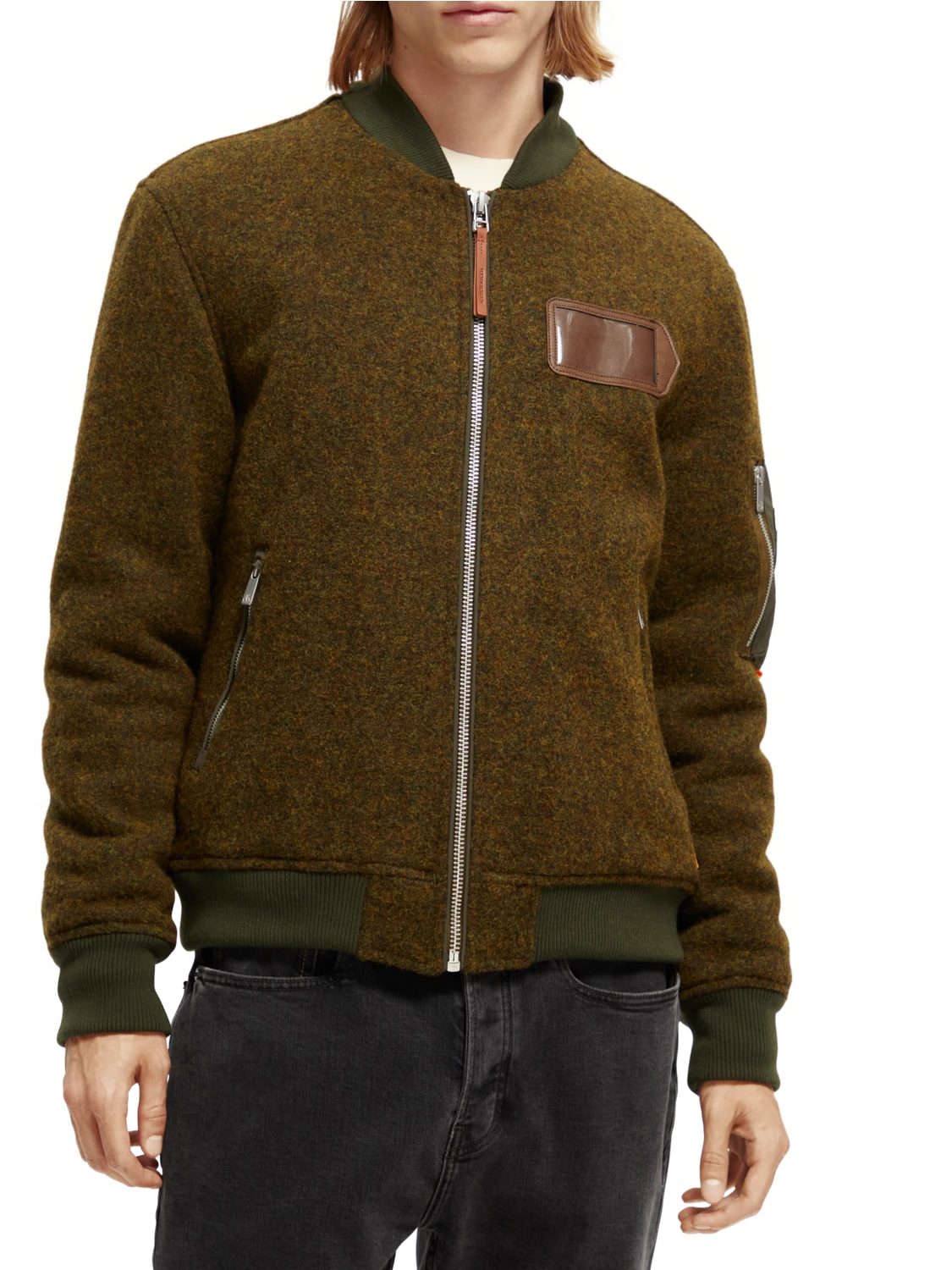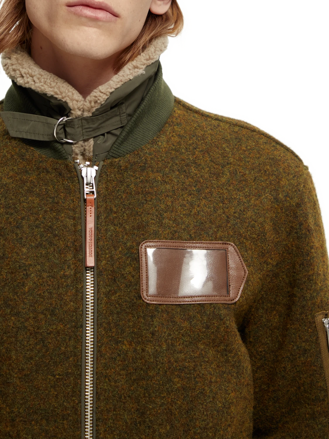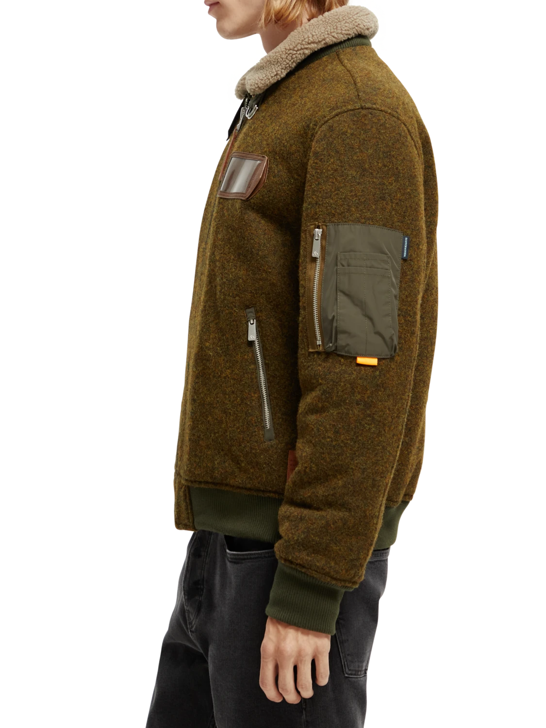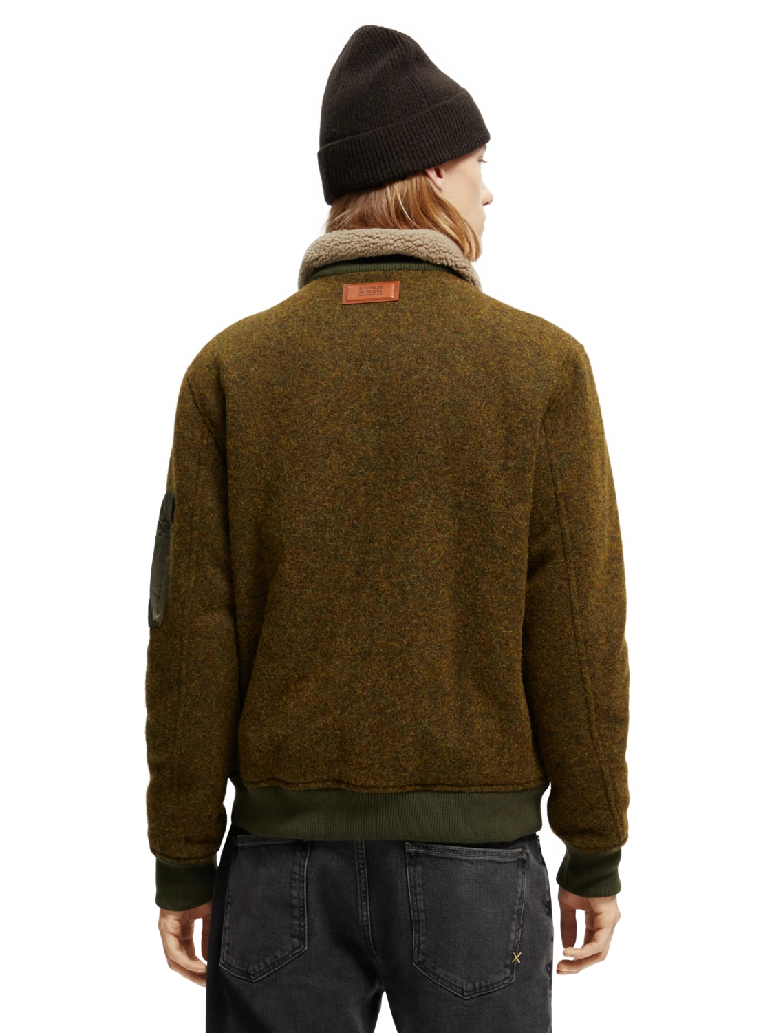 The bomber jacket is a proven style, popular across generations. Made from a wool (70%) blend, teddy color, finished with a ribbed hem and cuff .